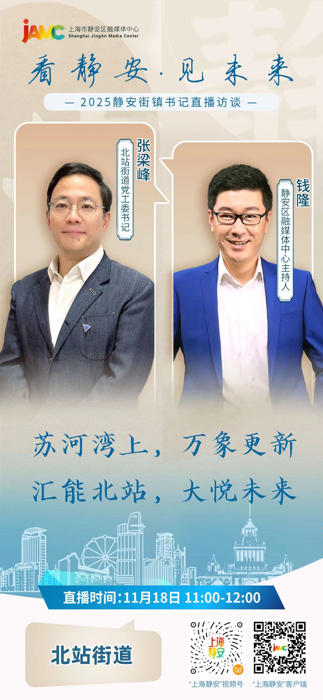 11月18日11:00—12:00,北站街道党工委书记张梁峰、静安区融媒体中心主持人钱隆,与您相约“看静安·见未来”2025静安街镇书记直播访谈。