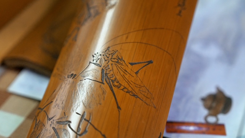 金钦安自幼受徐孝穆亲传,深得师傅技法精髓。他的刻刀下,既有徐派竹刻“刀痕藏笔意”的神韵,将书法的提按顿挫、绘画的虚实疏密精准复刻于竹面;又融入了自己对生活与艺术的独到感悟,让传统题材焕发新意。金老师最喜欢雕刻的就是《虫草图》,在这些竹刻作品上,金钦安以刀代笔,将蛐蛐的健硕、蚂蚱的灵动刻画得栩栩如生。他常说,昆虫虽寥寥数笔勾勒,精髓却全在须与脚两道线条——细如发丝的虫须要挺而不僵,带着微风拂过的轻颤感;短短数节的虫脚需曲直有度,藏着跃动欲起的力道。