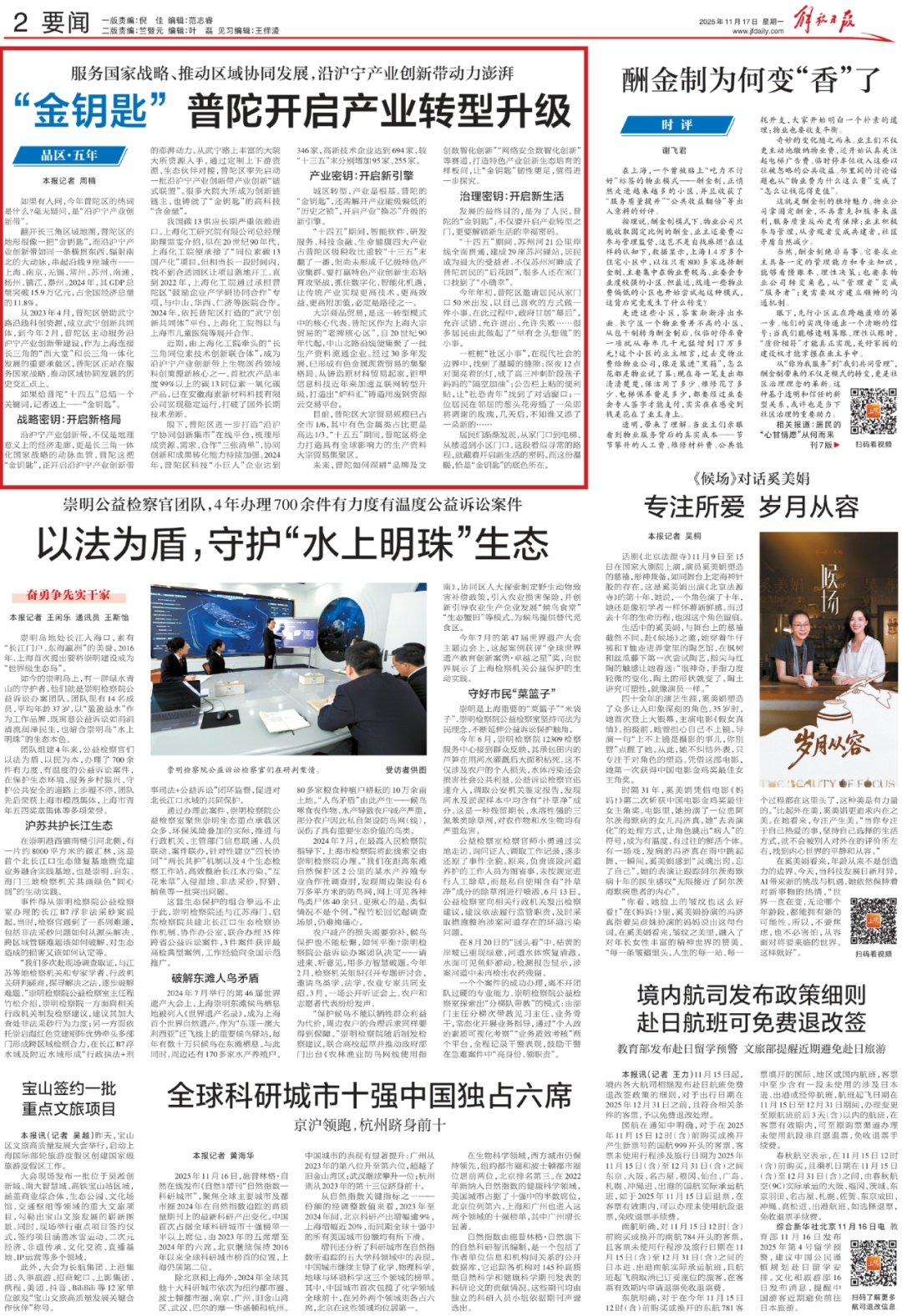 11月17日,《解放日报》2版要闻报道: “金钥匙”普陀开启产业转型升级 如果有人问,今年普陀区的热词是什么?毫无疑问,是“沿沪宁产业创新带”。 翻开长三角区域地图,普陀区的地形很像一把“金钥匙”,而沿沪宁产业创新带如同一条横贯东西、辐射南北的大动脉,串起沿线9座城市——上海、南京、无锡、常州、苏州、南通、扬州、镇江、泰州。2024年,其GDP总量突破15.9万亿元,占全国经济总量的11.8%。 从2023年4月,普陀区借助武宁路沿线科创资源,成立武宁创新共同体,到今年2月,普陀区主动服务沿沪宁产业创新带建设,作为上海连接长三角的“西大堂”和长三角一体化发展的重要承载区,普陀区正站在服务国家战略、推动区域协同发展的历史交汇点上。 如果给普陀“十四五”总结一个关键词,记者送上——“金钥匙”。