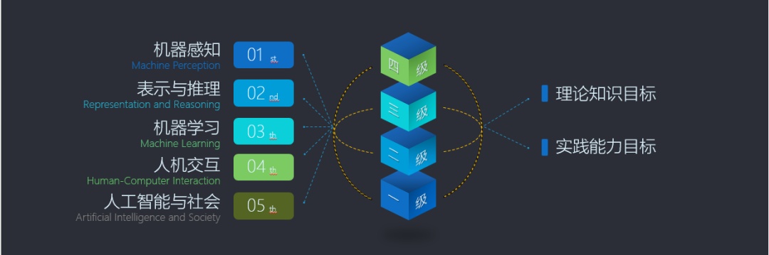 课程内容对标青少年人工智能能力1级——AI机器视觉,从人工智能与社会、机器感知、表示与推理、机器学习、人机交互五个板块,理论知识与实践能力两个维度进行设计。