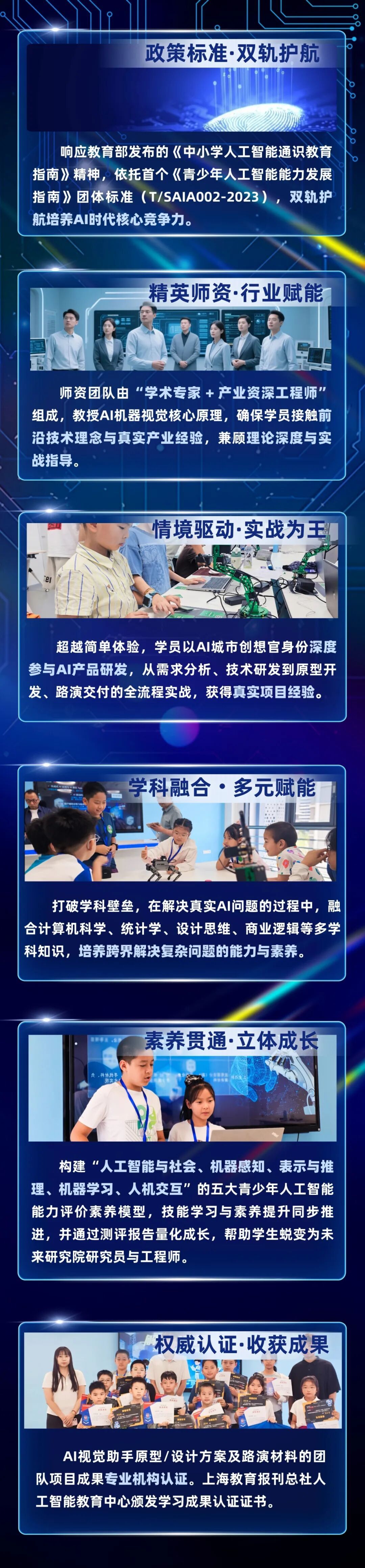 以《中小学人工智能通识教育指南》《上海市中小学人工智能课程指南》《青少年人工智能能力发展指南》团体标准的人工智能通识教育实践学习内容为课程基础,引导学生在人机交互情境中学习图像识别、机器智能应用,在从体验、探究到动手的实践过程中,完成AI单项技能到综合素养的跃迁式成长,实现从AI技术、伦理更新到创新研究的蜕变。构建“情境式体验 + 项目化实训 + 跨学科融合”的青少年人工智能核心素养培养新模式,帮助青少年系统化建立人工智能知识、技术、能力完整体系,全面提升AI综合素养与创新能力。