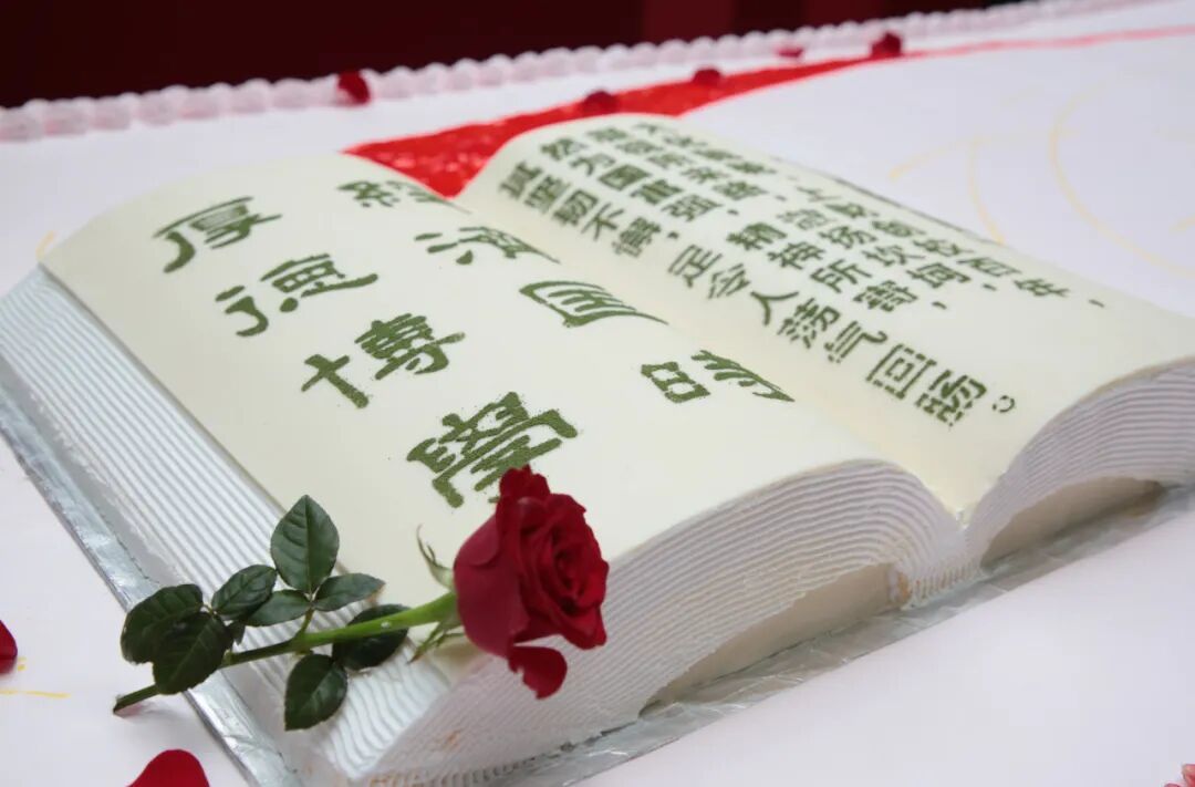 这份由食堂点心师傅们连夜匠心制作的蛋糕,长6米,宽2米,以其磅礴气势象征着上财108年来的深厚积淀。蛋糕设计别具匠心:顶部不仅绘有精美的校徽、校训及标志性校门图案,还有庆祝上海财经大学建校108周年的醒目logo。尤为引人注目的是,立体的《上财赋》跃然其上。其中“大化驰轮,上财创校百年,凝视所来路,激扬坎坷,然为国富强,精神所寄,其坚韧不懈,足令人荡气回肠”的词句,无声诉说着学校的百年风华与精神传承,引得师生纷纷驻足拍照,记录这难忘的瞬间。