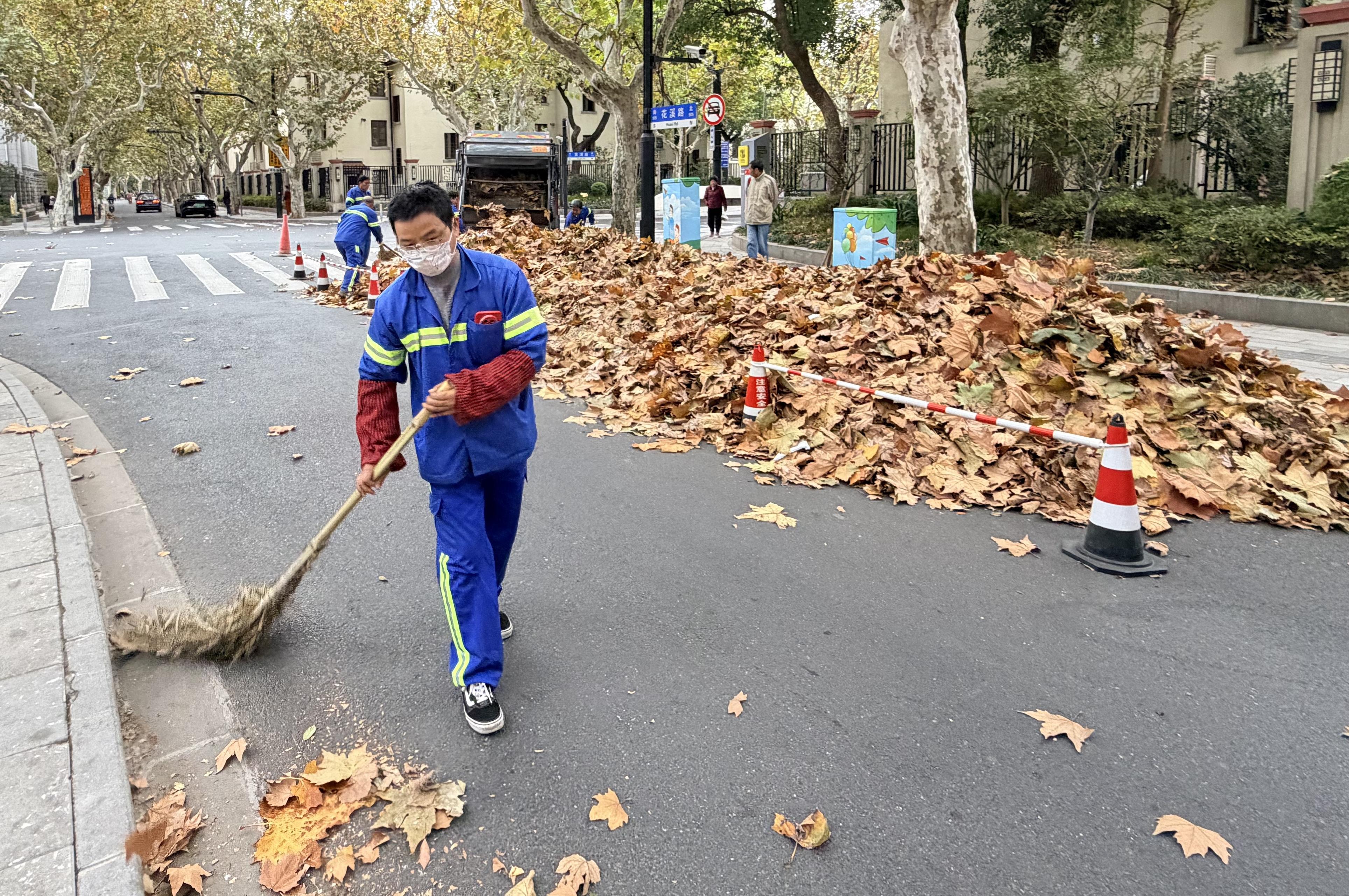 曹杨班班组长李佳在现场一边指挥,一边介绍情况:“一夜之间,悬铃木落叶清扫作业量较平日提升了8至10倍,今日普环二分公司曹杨班的130余名环卫工全员上岗,预估曹杨地区今天最高能清扫25吨落叶。”