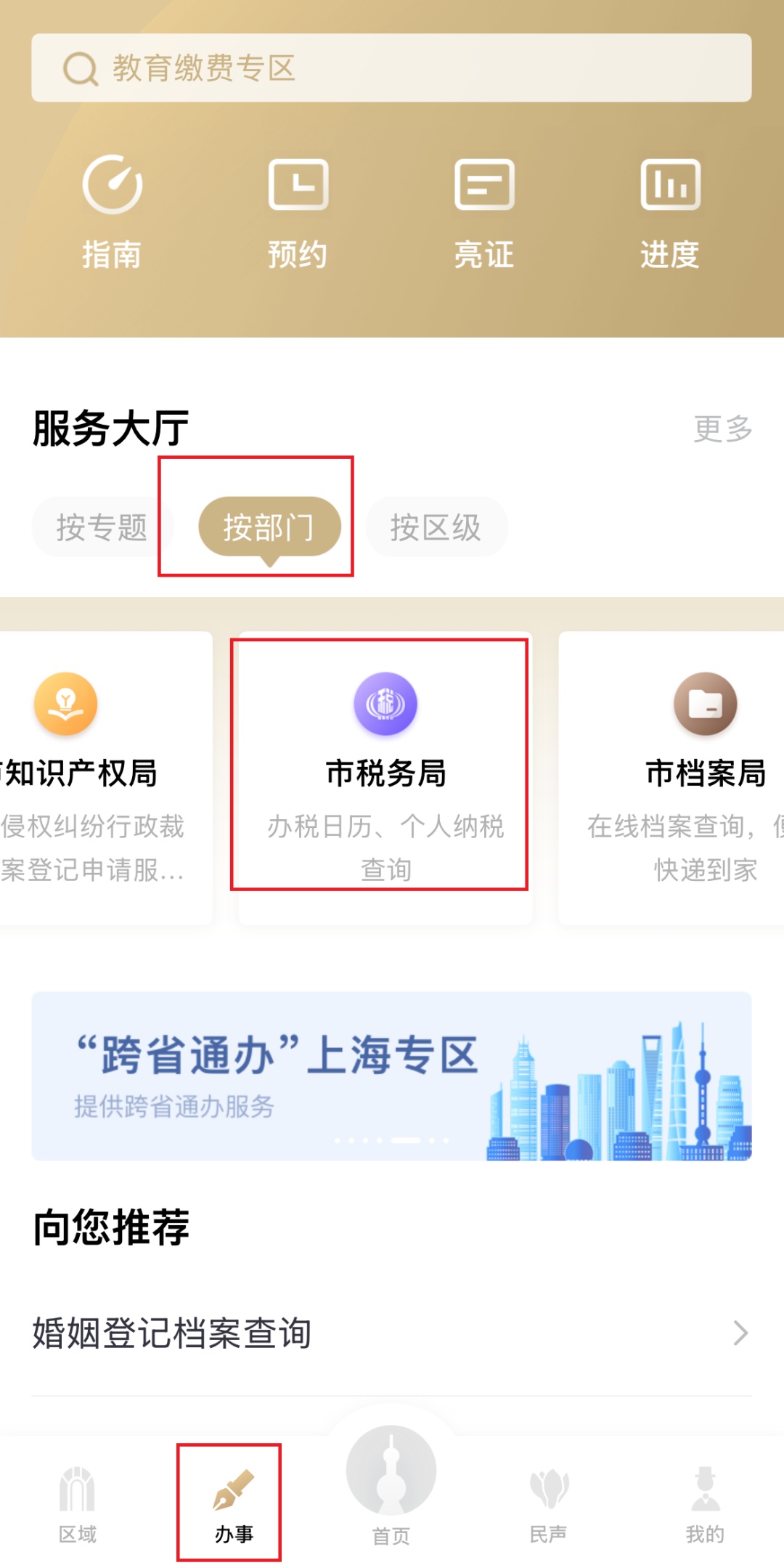 步骤一:首页选择【办事】界面—【按部门】—【市税务局】—【灵活就业及城乡居民社会保险费缴费证明开具】,或首页直接搜索【灵活就业及城乡居民社会保险费缴费证明开具】。