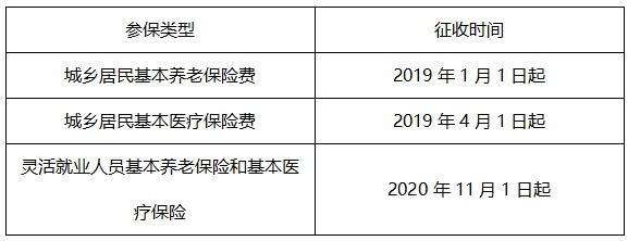 4.自2019年1月1日起城乡居民社会保险费征管职责划转至税务部门;自2020年11月1日起灵活就业人员缴纳的基本养老保险、基本医疗保险交由税务部门统一征收。本功能支持城乡居民及灵活就业人员查询和打印由税务部门征收的社会保险费缴费记录,详见下表。