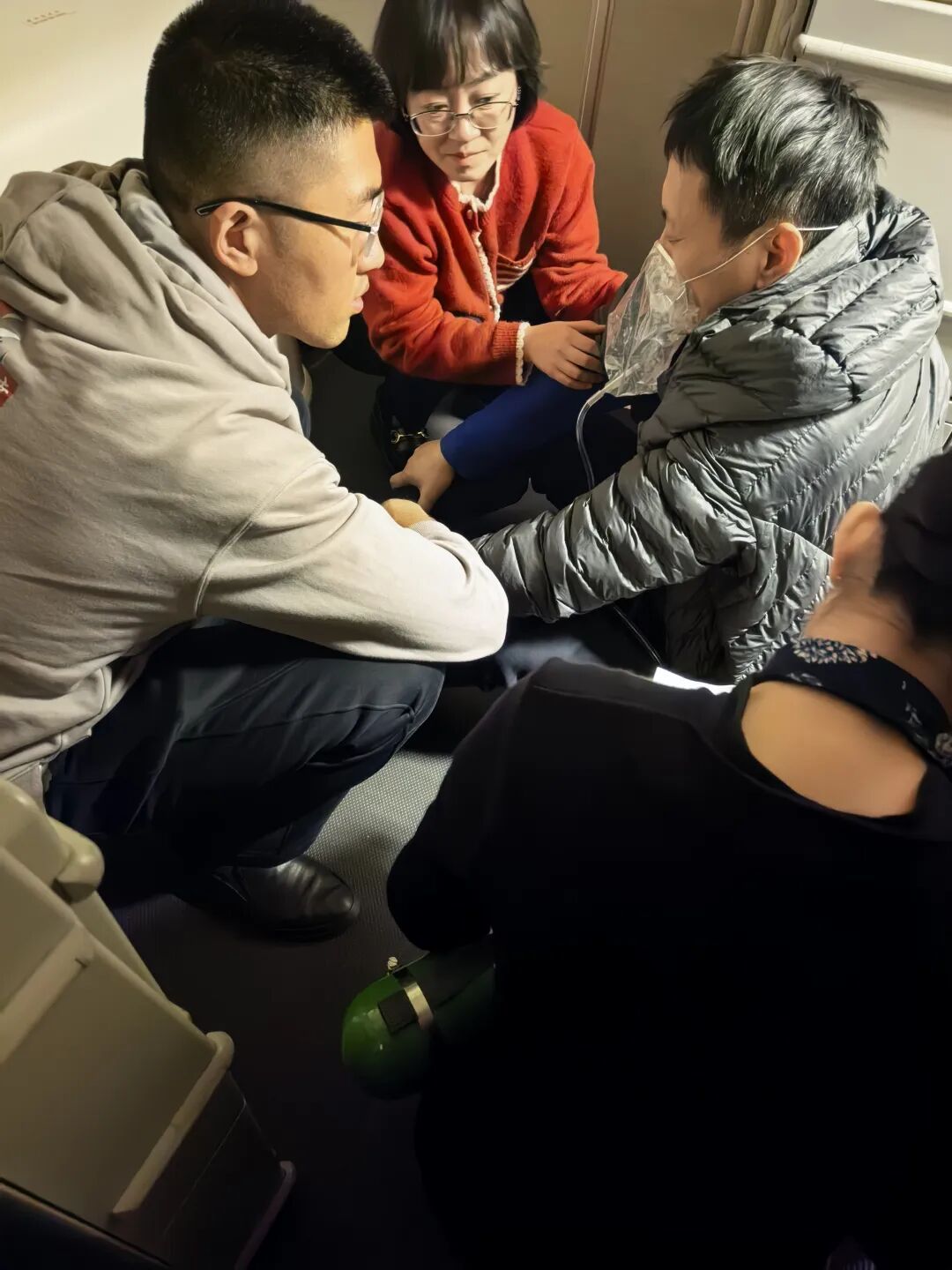 在机舱狭小的空间内,一场争分夺秒的救护迅即展开。乘务员迅速取来机上急救包和便携式氧气瓶,让乘客平卧吸氧。三位重症医学专家轮流为其监测血压、心率与血氧饱和度,乘务组则全程陪护,每10分钟详细记录一次生命体征数据。