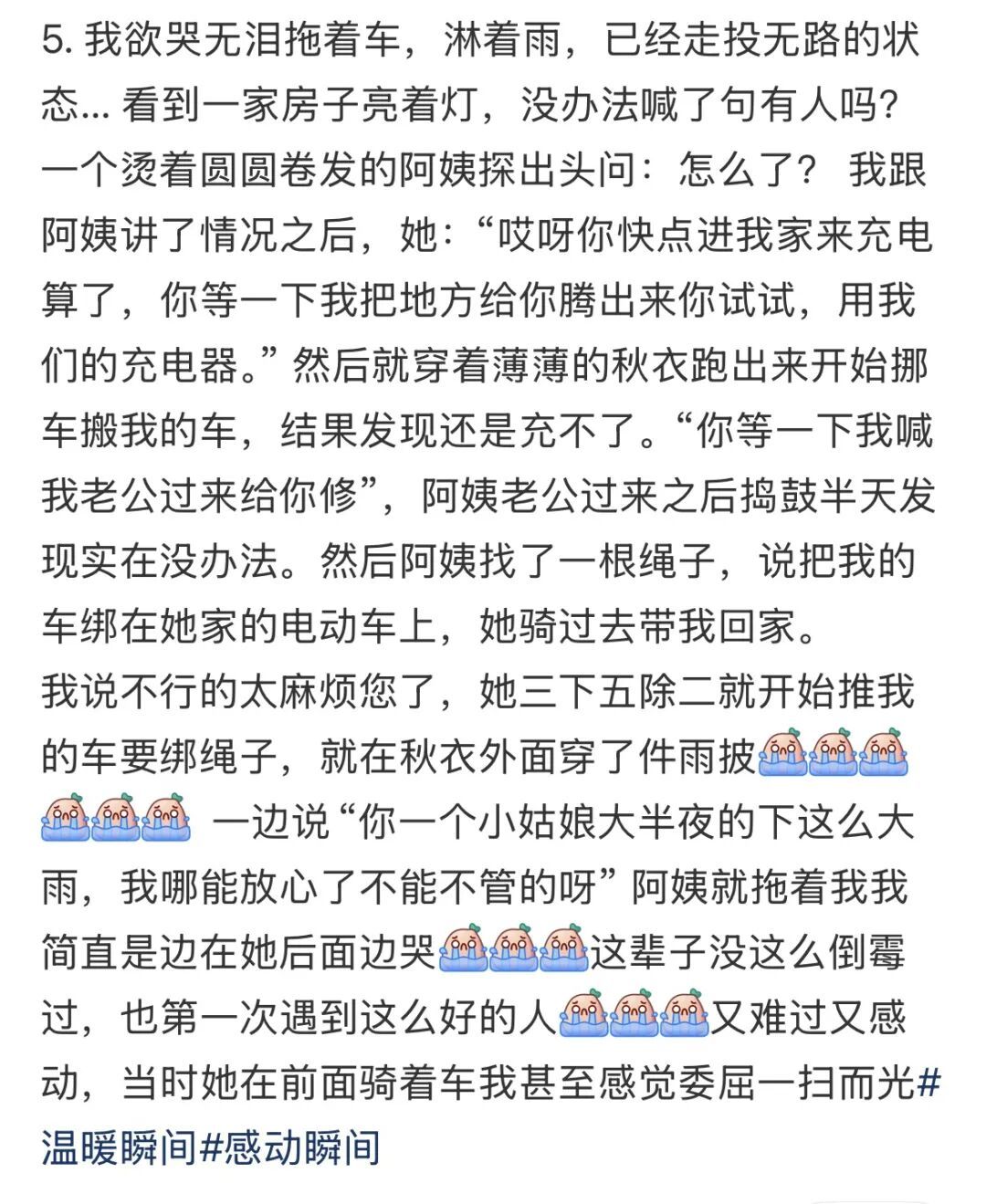 她说你这样,你家里住在哪里,我去拿一根绳子,我把你的车绑在我家电动车后面,我骑电动车送你回去吧,就是在后面拖着你。我当时下意识说那也太麻烦您了,她说你不要想那么多,都是小事情,一个人在外面,你是一个小姑娘,我们肯定要帮你的呀,我不能放着你不管呀。