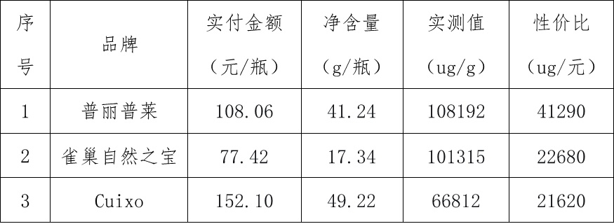注:性价比(μg/元) = (叶黄素实测值×净含量)/实付金额