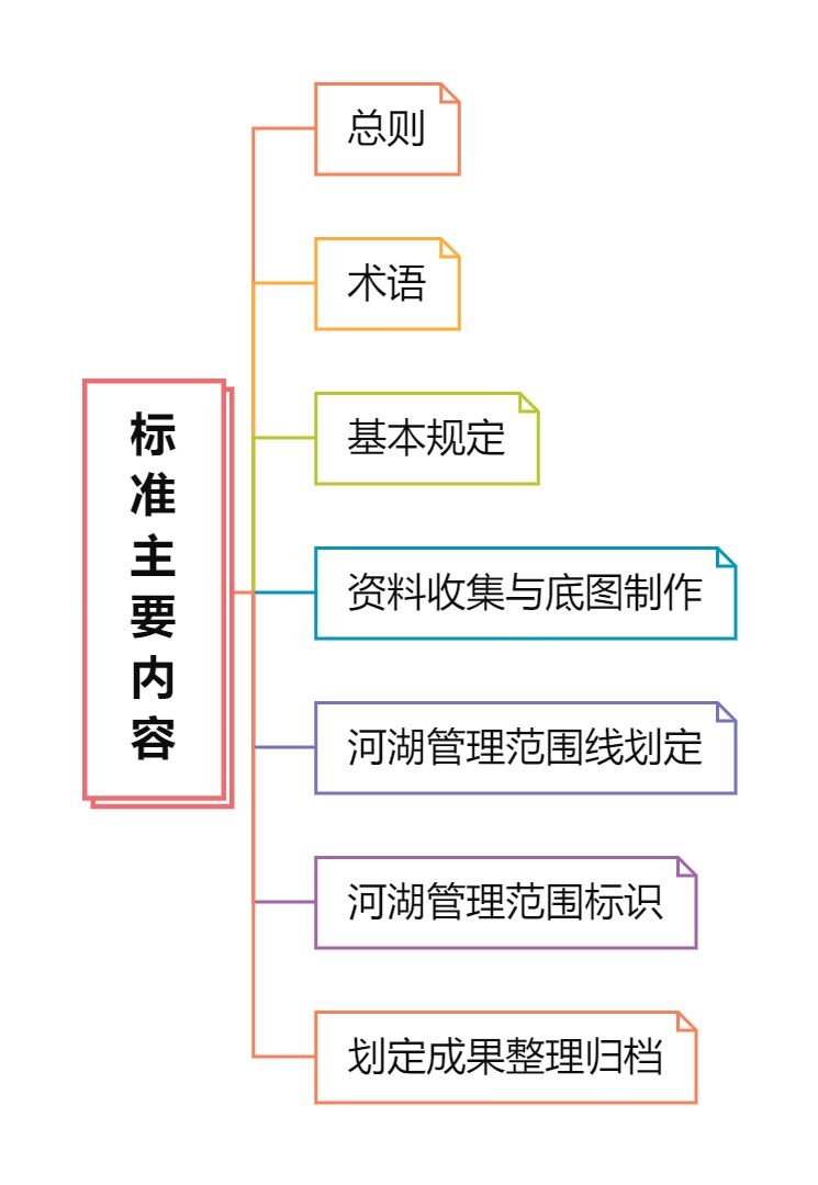 标准共7大部分,分别为总则、术语、基本规定、资料收集与底图制作、河湖管理范围线划定、河湖管理范围标识、划定成果整理归档等。