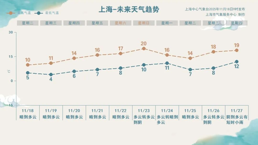 明后天受辐射降温影响,早晨气温降至0℃-2℃,局部有薄冰。白天天气晴好,气温稳中有升,预计周日最高气温可升至20℃左右。需要注意的是持续晴好天气,空气干燥,注意用火用电安全。