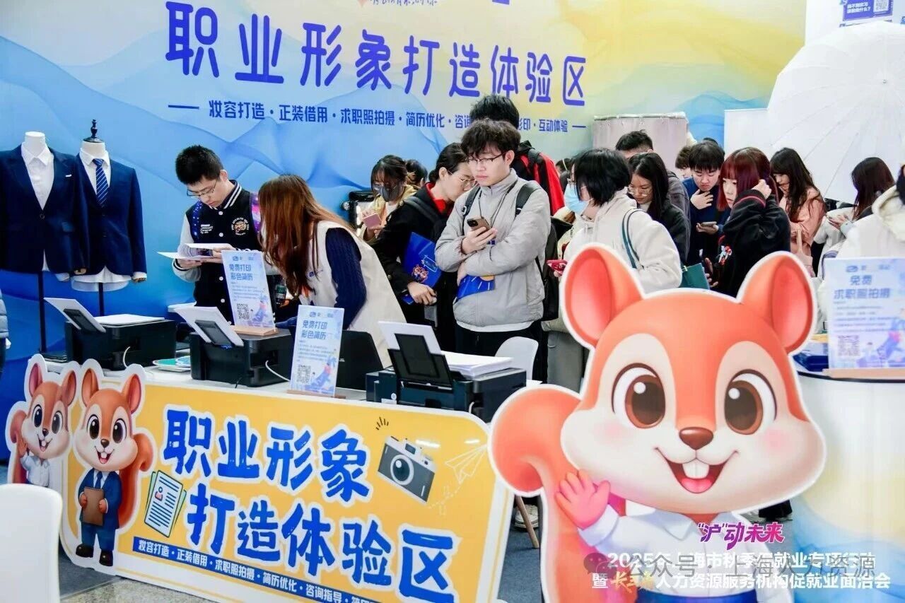 招聘现场设置的“AI体验区”集中展示多类智能终端设备,包括AI简历优化打印一体机、AI面试屏与AI生涯规划一体机,覆盖从简历撰写