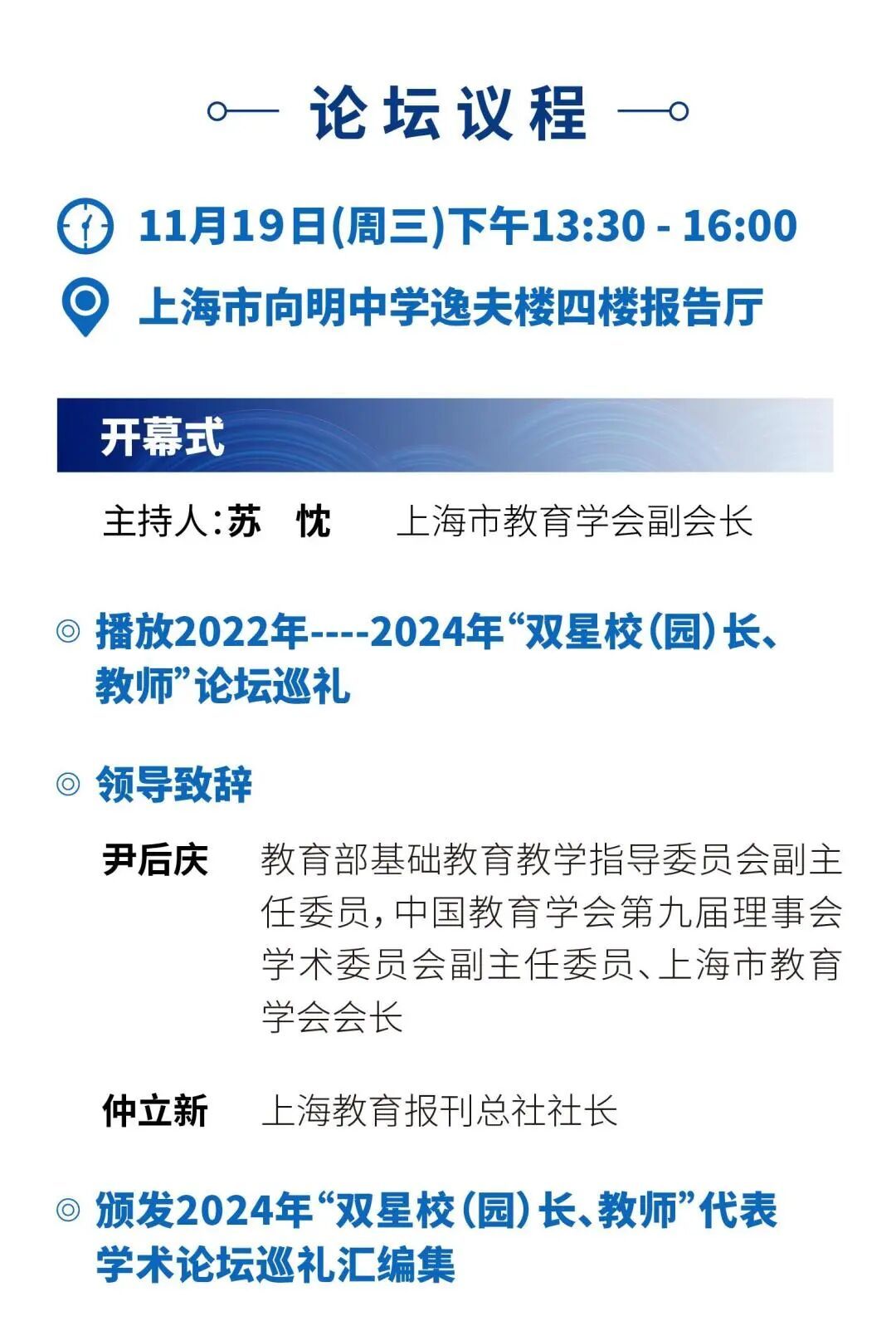 教育是国之大计,党之大计。2025年1月,中共中央、国务院印发《教育强国建设规划纲要(2024—2035年)》,明确了教育强国建设的总体要求。为推进教育强国建设,推动高素质专业化教师队伍建设,深化教育综合改革,根据《上海市教育学会中青年校(园)长、教师系列论坛活动方案》(上海市教育学会【2022】4号) 要求,上海市教育学会与上海教育报刊总社联合主办“2025年‘星校(园)长、星教师’论坛”。