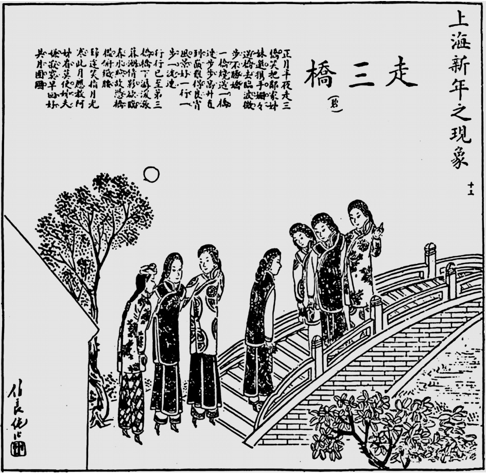 儿童携彩纸糊兔子、鸡、鸭等花灯结伴夜游,谓“走三桥”。村童夜行,执火把,烧田埂枯草,称“煺茅荡”,边燃边唱。浦东童喊“花好稻好,白绿豆全好”,“花三担、稻六石”;浦西童喊“大家好,大家好,人家田里出棵草,伲个田里出棵稻,人家田里狗屙墩,伲个田里白米囤”“家家好,家家好,自家田里老白花(棉),人家田里全是草”。入夜,闺中女儿“坑三姑娘”。20世纪60年代,各俗渐渐消失,仅剩吃圆子、吃馄饨。近年,又有届时儿童上街戏灯,多用兔子灯,以及燃放烟火、张灯结彩等过节。