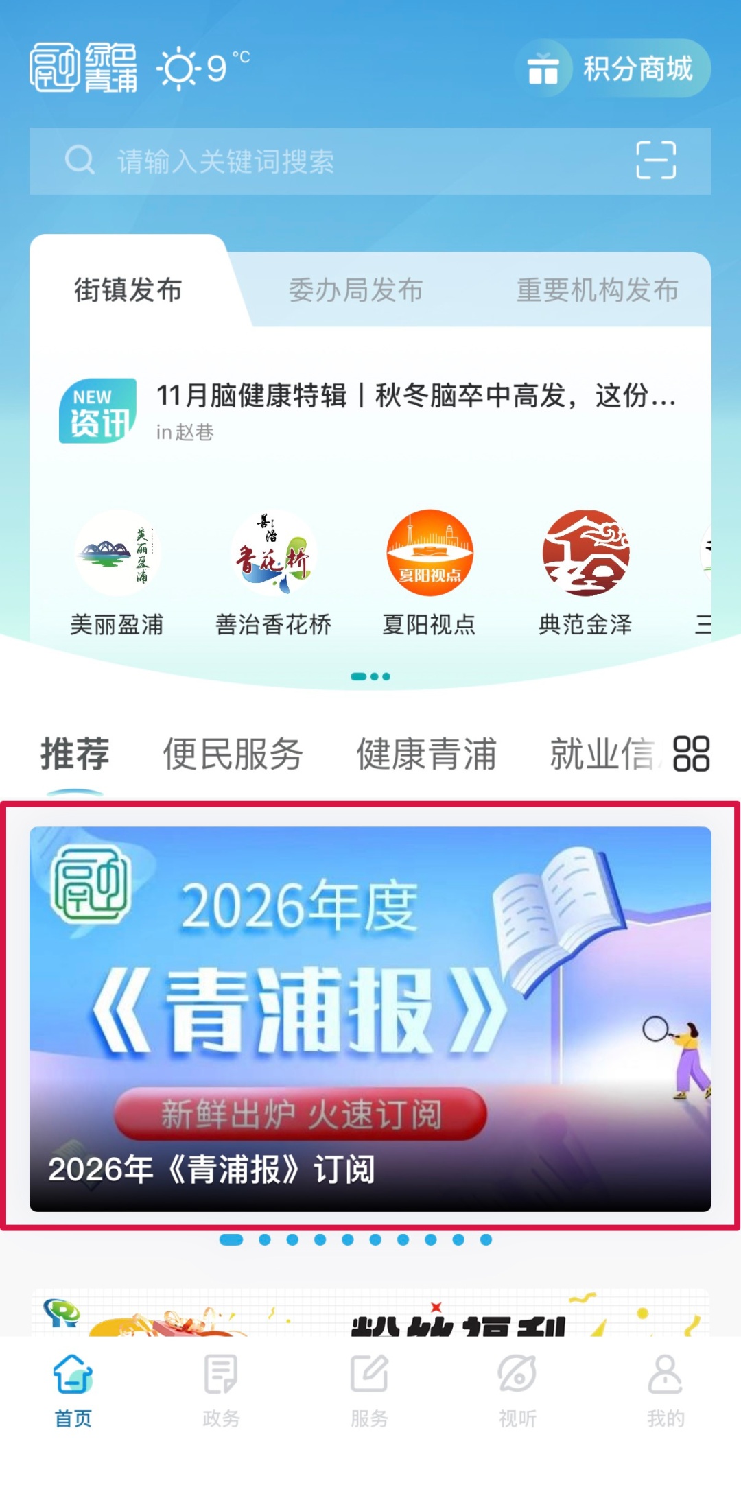 1、打开“绿色青浦”APP首页→点击banner栏内“2026年度青浦报订阅”。