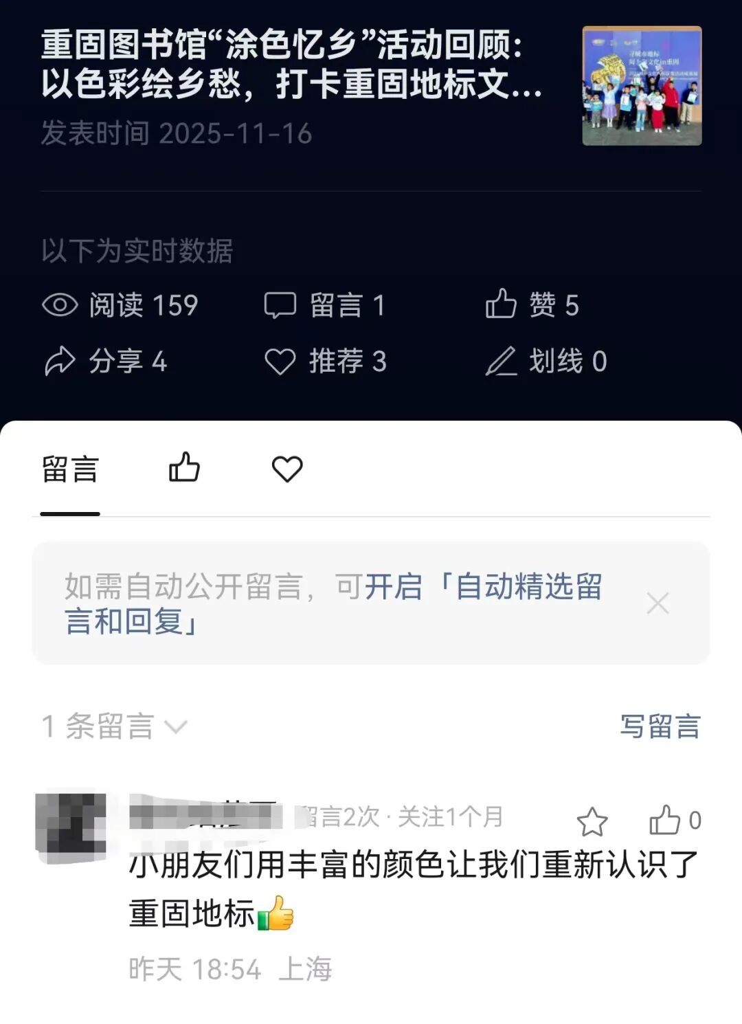 重固镇图书馆与混知的跨界共生,为基层文化服务创新、破圈提供了新思路。以用户需求为核心,让知识告别高冷、走进日常,阅读的种子便在这片土壤中自然生根发芽。这座正在成长的“文化驿站”,将为重固镇文化振兴注入持久动力。