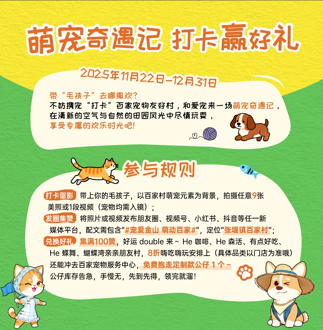 围绕“宠爱金山 萌动百家”主题传递文明养宠理念。宠物食品、实用周边、本地新鲜农产品、创意文创一应俱全,边逛边给毛孩子囤好物,还能解锁特色美食。