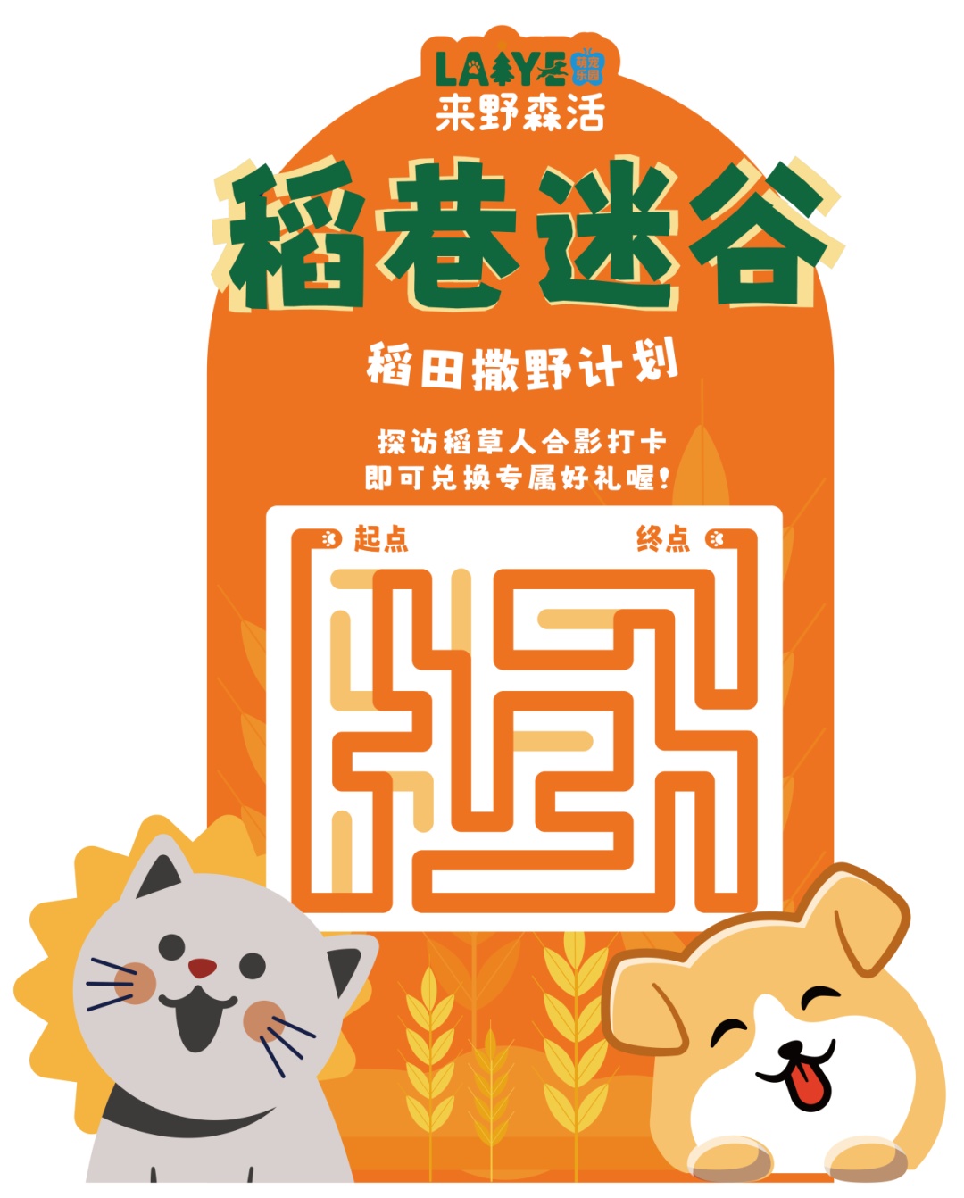 稻田区,宠物家庭穿越稻田迷宫,探访田间可爱的稻草人,拍照打卡定格田园美好瞬间,就能兑换专属纪念好礼。