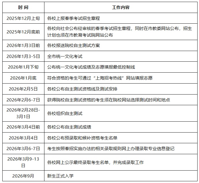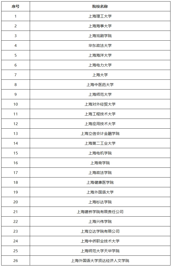 市教委介绍,根据《国务院关于深化考试招生制度改革的实施意见》《上海市深化高等学校考试招生综合改革实施方案》等精神,2026年上海市继续实施春季考试招生试点。2026年上海市共有26所试点院校参加春季考试招生。招生专业须是各校特色专业或应用型本科试点专业,并须经市教委审核批准。招生计划将根据各校申报情况,由市教委统筹下达。具体报名事宜、考试及志愿填报、录取等有关内容,详见↓