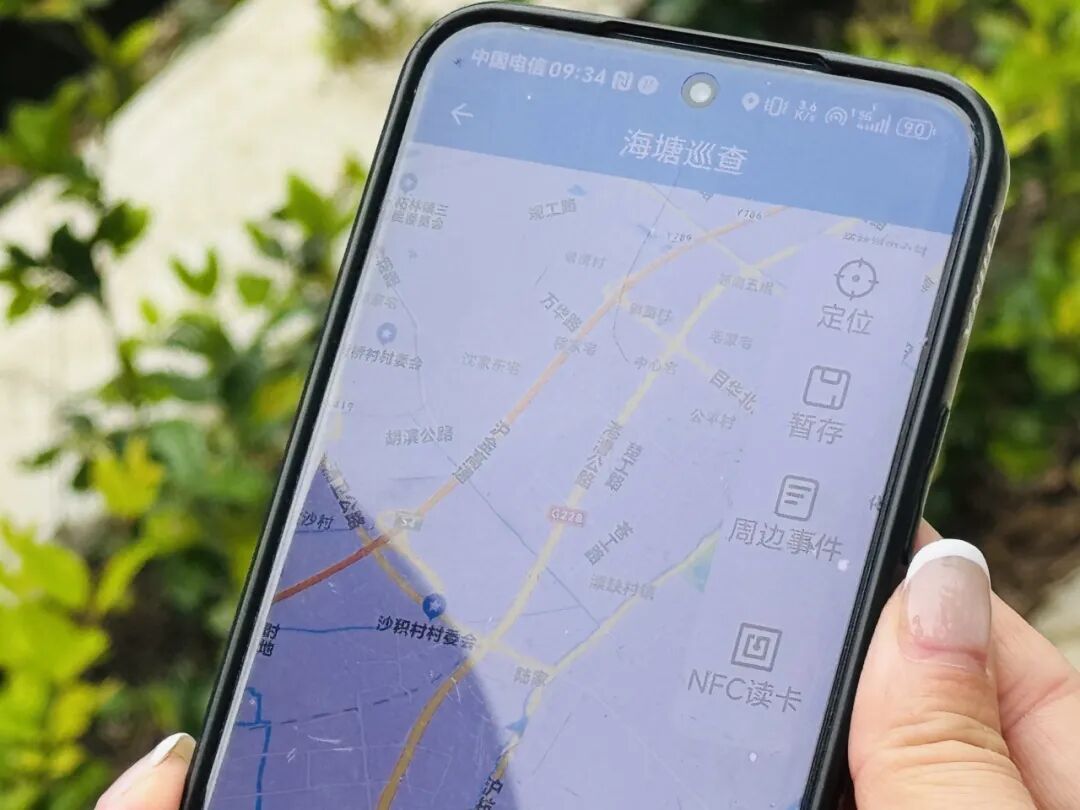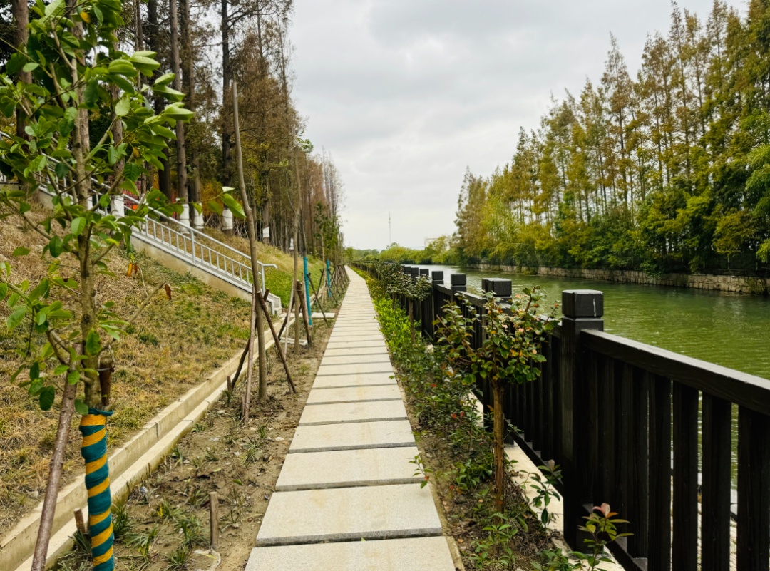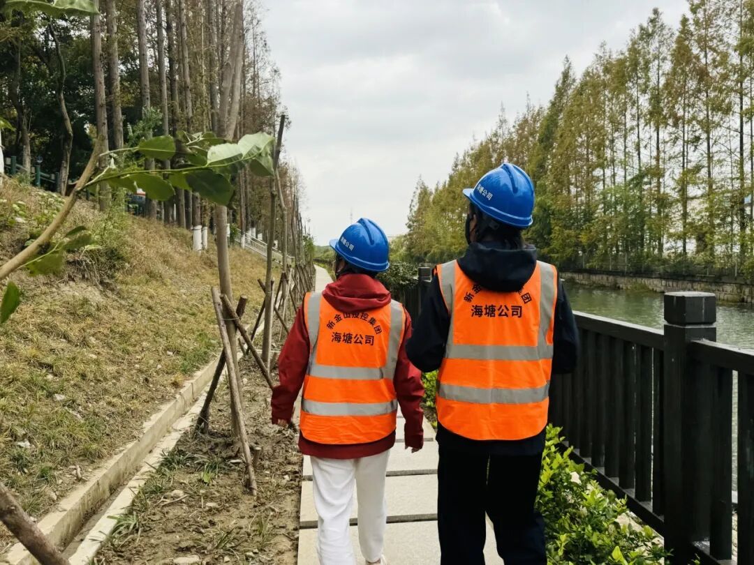 记者在金山海塘天华路段看到,内坡、护岸、步道、绿化均已建设到位。海塘巡查员们两人一组,正在内青坎进行日常巡查,清理排水沟内的垃圾,记录绿化存活情况。