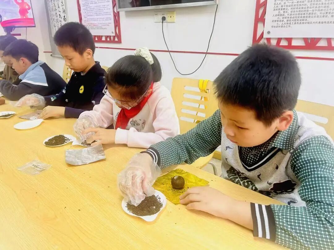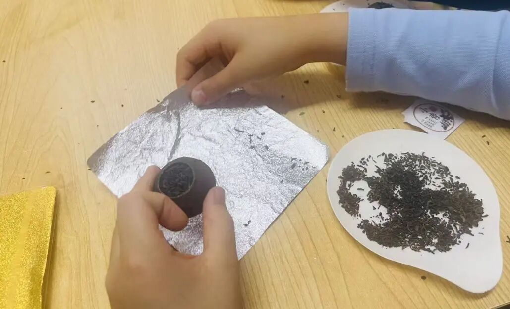 另一边,制作“小青柑”的工坊更是人气爆棚。孩子们人手一个青绿色的小柑橘,小心翼翼地掏空果肉,再一勺一勺地填入醇厚的普洱茶叶。挖果肉、填茶、封口、包上锡纸……每一个步骤,孩子们都做得一丝不苟,专注的神情仿佛是在雕琢艺术品。