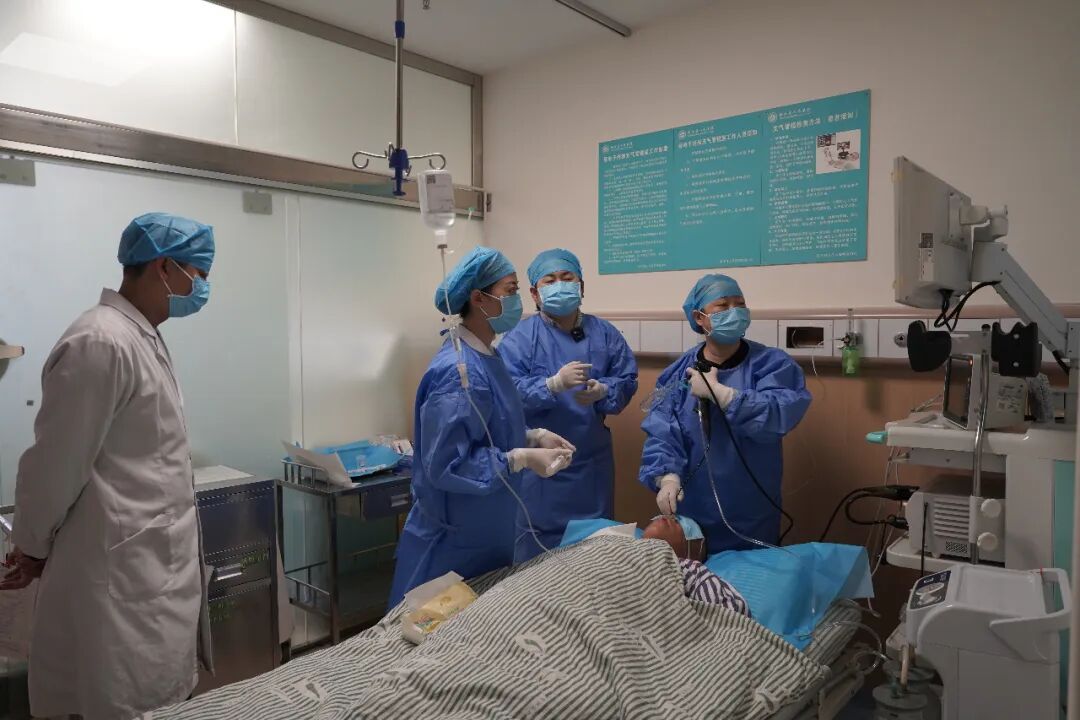 上海市第五人民医院援滇医生李俊卿在绥江县人民医院呼吸内科指导当地医务人员实施支气管镜检查