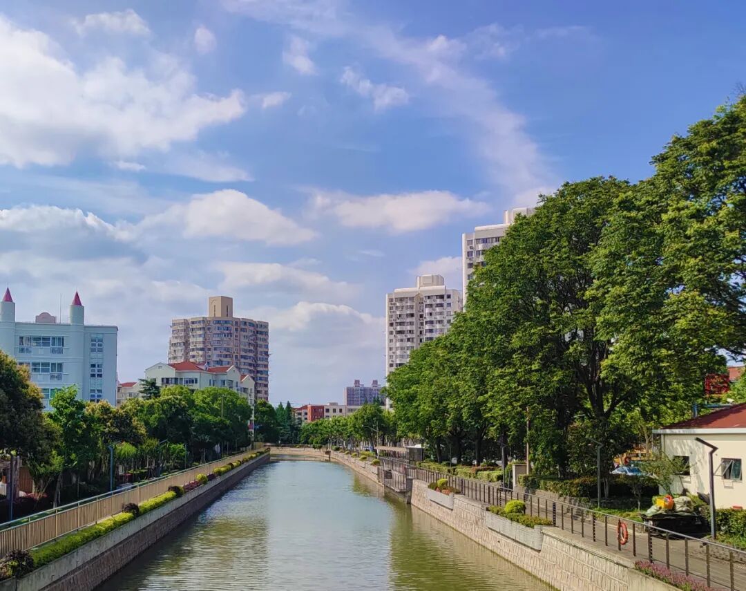 云卷云舒,河道两岸郁郁葱葱,如今的北潮港,水体清澈透明,水岸景色优美,已成为市民的休闲散步好去处。行人临河漫步,凭栏远眺,在蔚蓝天空下聆听河水潺潺,每一个角落似乎都在讲述关于“水”的故事。