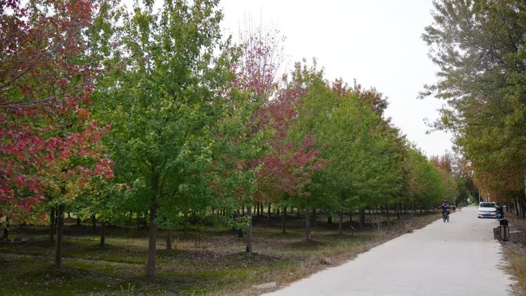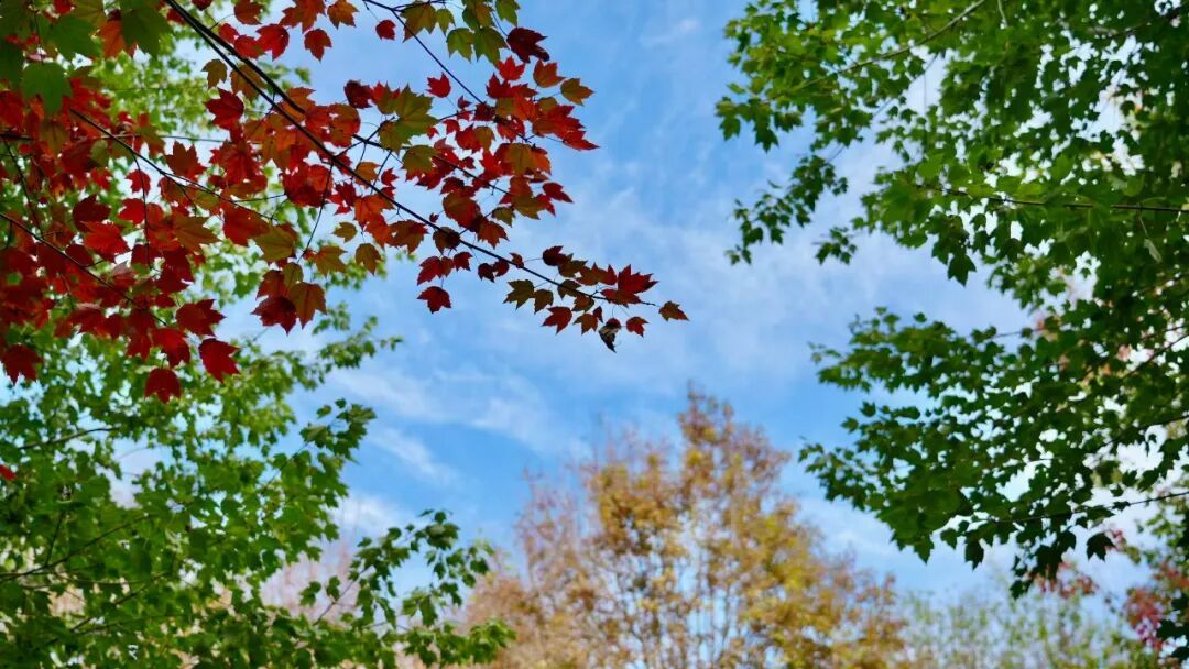 近日,记者在枫叶岛看到,成片的枫林开始转色,红黄绿相间的枫叶层层叠叠,与蓝天白云相互映衬。林中,市民游客纷纷拿起手机和相机,打卡记录这一抹属于秋冬的美丽。