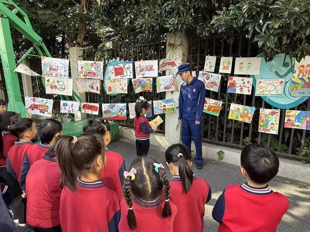 “消防衣服穿好需要多少时间?”“拨打119电话,消防叔叔多久能赶到现场?”“消防车云梯有多长?” 活动中,周边幼儿园的小朋友们带来了消防主题绘画作品,还通过画作向消防员提出疑问。微型消防站队员耐心解答了孩子们的问题,互动氛围十分热烈。
