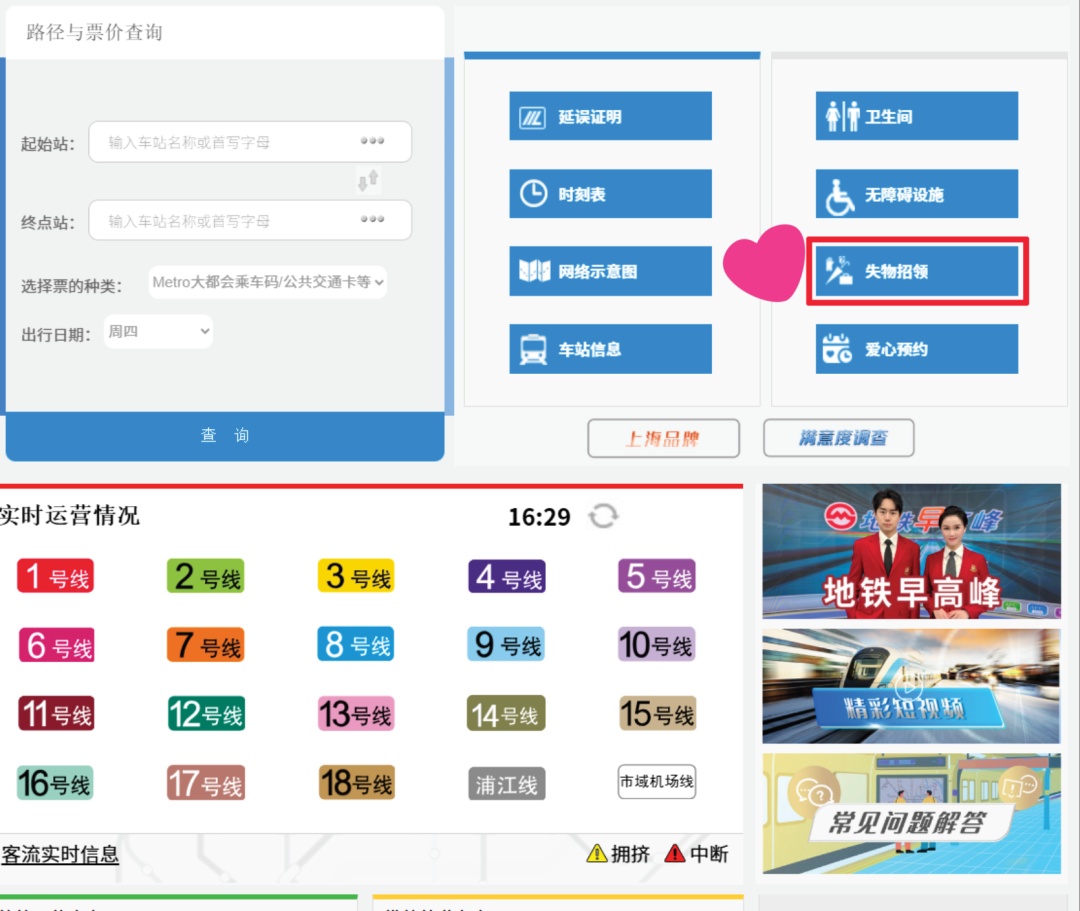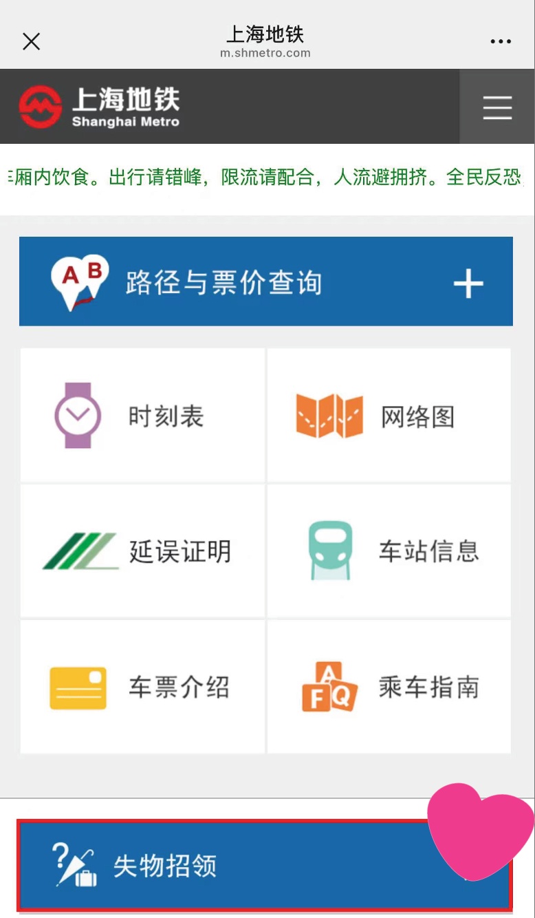 在地铁里遗失物品怎么办?如何“挂失”?如何“寻单”?“失物招领”功能了解一下! 在上海地铁官网运营网页(电脑版、手机版)提供“失物招领”功能。市民乘客在地铁内遗失物品后,可第一时间在上海地铁官网运营专页上自助挂失、自助查询。 上海地铁官网运营专页(电脑版) 进入方式 上海地铁官网运营专页(手机版) 进入方式 开放地铁官网自助挂失 提高寻找遗失物品效率 为了丰富报失渠道、简化失主报失的流程、提升管理水平、提高寻物效率,给广大市民乘客提供了一条更全面、方便、快捷的寻物渠道,上海地铁已在上海地铁官网运营网页(电脑版、手机版)同步开放“失物招领”功能。该功能将通过大数据分析,信息自动化对比,自动识别、匹配乘客挂失物品和车站捡拾、乘客上交的遗失物品,提高寻找遗失物品的效率。 “失物招领”功能上线公测后,车站捡拾到遗失物品或收到乘客上交的遗失物品后,相关物品信息将统一录入官方平台管理。乘客在地铁内遗失物品,可第一时间在上海地铁官网上进行自助挂失,后台将把乘客报失物品信息和管理平台内遗失物品信息在48小时内不间断地进行匹配、比对,并将查询结果用微信或短信的方式通知失主。匹配成功,将通知失主让其到相应车站辨认,如确认是失主遗失物品,车站将在办理相关手续后让乘客领取失物。如后台未匹配到对应的遗失物品,或失主到车站后发现物品并非自己的遗失物品,乘客可再次在上海地铁官网运营网页上进行挂失,重新寻找,也可寻求车站工作人员帮助或拨打服务热线021-64370000。 友情提示: 1.请乘客妥善保管好随身物品,如遗失物品,可使用上海地铁官网运营专页“失物招领”功能进行自助挂失。 2.乘客如在地铁内捡到遗失物品,请交给车站工作人员,以便工作人员按要求录入遗失物品相关信息,便于查找。 编辑:孙宇瑶(实习) 资料:上海一网通办总门户 *转载请注明来自上海宝山官方微信