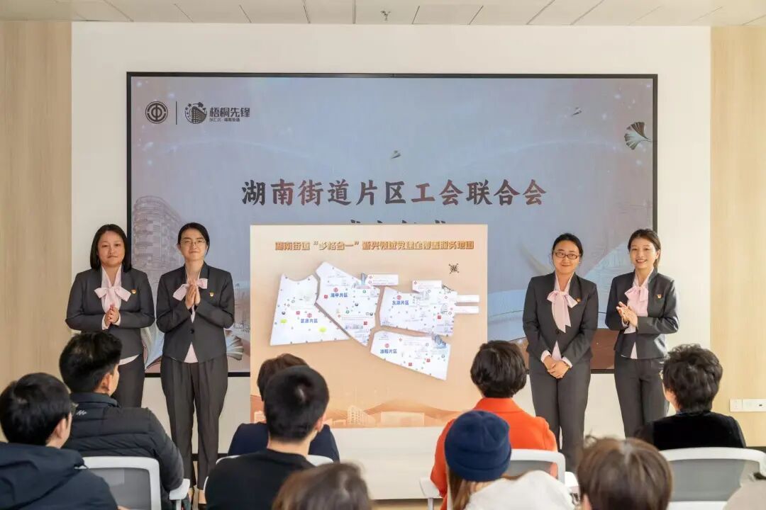 11月18日,徐汇区湖南街道迎来了工会建设的重要里程碑:覆盖湖南街道全域四个片区的片区工会联合会成立仪式,在环贸党群服务中心·职工之家举行,全市首创的徐汇区湖南街道话剧工作者联合工会也同步揭牌。市总工会副主席丁巍,区人大常委会副主任、区总工会主席朱伟红等出席活动。