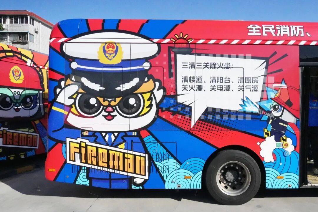 消防巴士车身采用消防标志性的红蓝两色、橙黄亮色为主色调,搭配“全民消防,生命至上——安全用火用电”消防宣传月主题标语和防火提示,成为穿梭在城市中亮眼的“移动消防宣传站”。车厢内聚焦沉浸式消防互动空间打造:座位椅背和扶手拉环分别贴有通俗易懂的消防小贴士,内容涵盖用火用电规范、家庭防火技巧、火灾逃生要点、消防器材使用等关键领域;车内挡板设置生动有趣的消防安全问答,与椅背提示形成互补,让乘客沉浸在全景式消防空间中,在潜移默化中学习消防知识。