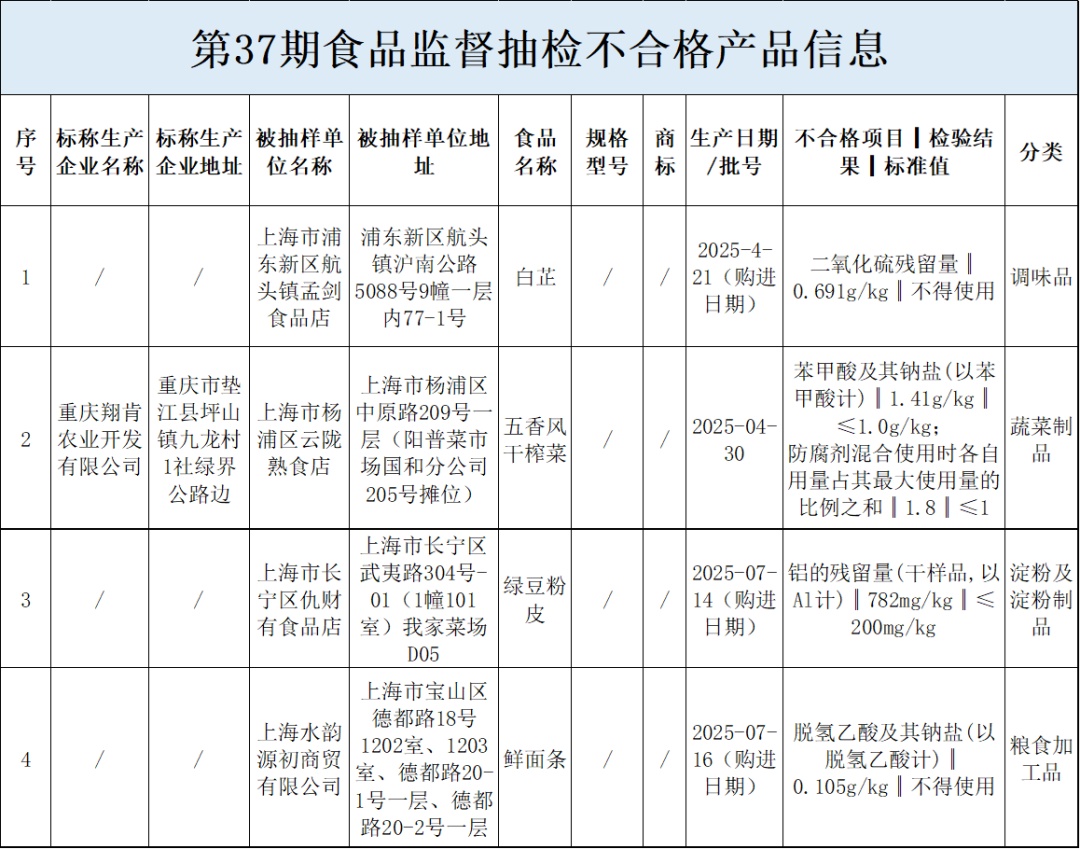 第37期省级食品安全抽检信息