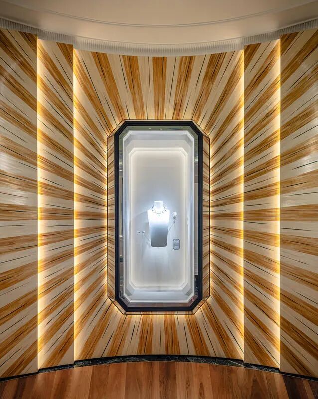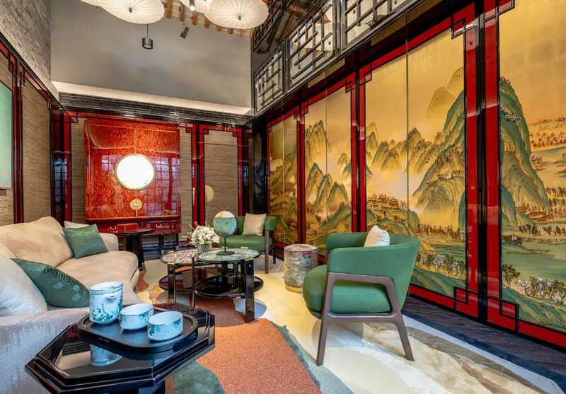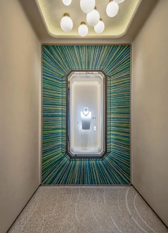 更有趣的是,法式与中式美学的精髓,借由绿与红这两种色彩巧妙交融。为呈现这一设计,宝诗龙邀请艺术家Olga Thune-Larsen参与创作,她以秸秆镶嵌作品赋予展柜璀璨夺目的视觉效果。点缀其间的红色玻璃致敬了亚洲文化中这一色彩所承载的深远意蕴,而绿色则是宝诗龙的标志性色彩。