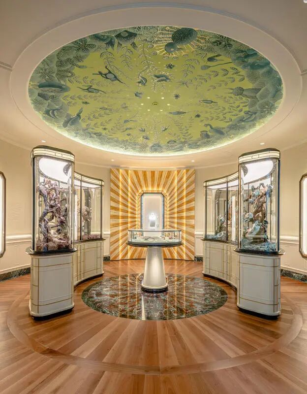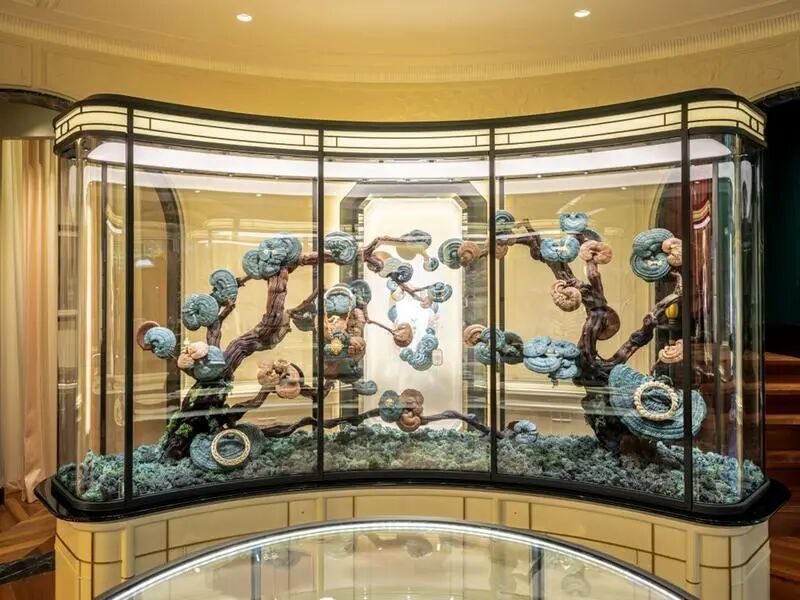 室内空间亦不乏自然元素。艺术家的中国森林景观在中央橱窗中展出,一棵棵灵芝生机勃勃,象征着长生、健康与活力。同时,灵芝如森林地表静默生长的植被一般,承载着自然低调质朴的意涵,而这与宝诗龙所秉持的理念不谋而合。宝诗龙标志性的Serpent Bohème系列与Quatre系列作品巧妙融入这片自然景致之中。