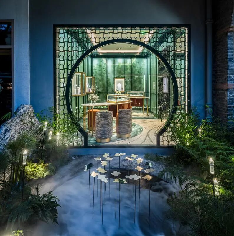 旗舰店的第二个入口同样呼应自然主题,向中国古典园林的诗意之美致敬。在这里,传统建筑中极具代表性的月洞门象征着从一方空间自然过渡至另一重天地。