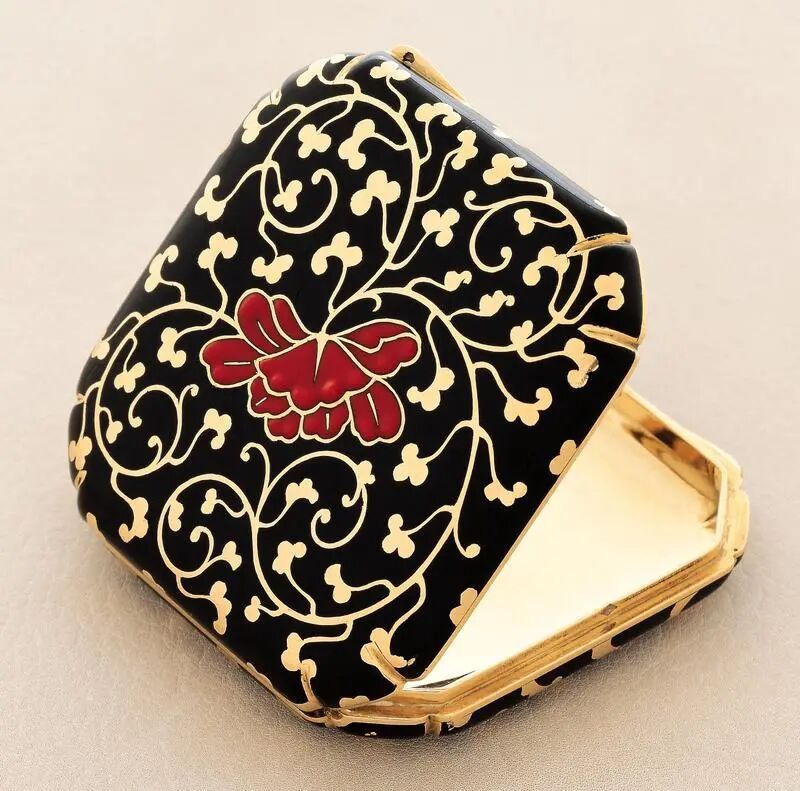 比如,一件于1923年创作的化妆盒,其采用黄金、铂金制成,并镶嵌彩色珐琅及钻石,细腻描绘出一幅中国山水画卷,中央更以“寿”字纹样点缀,寄托延年益寿与恒久幸福的祈愿;另一件1925年问世的黄金粉盒,以彩色珐琅勾勒牡丹盛放之姿——在中国文化中,牡丹象征着富贵荣华。