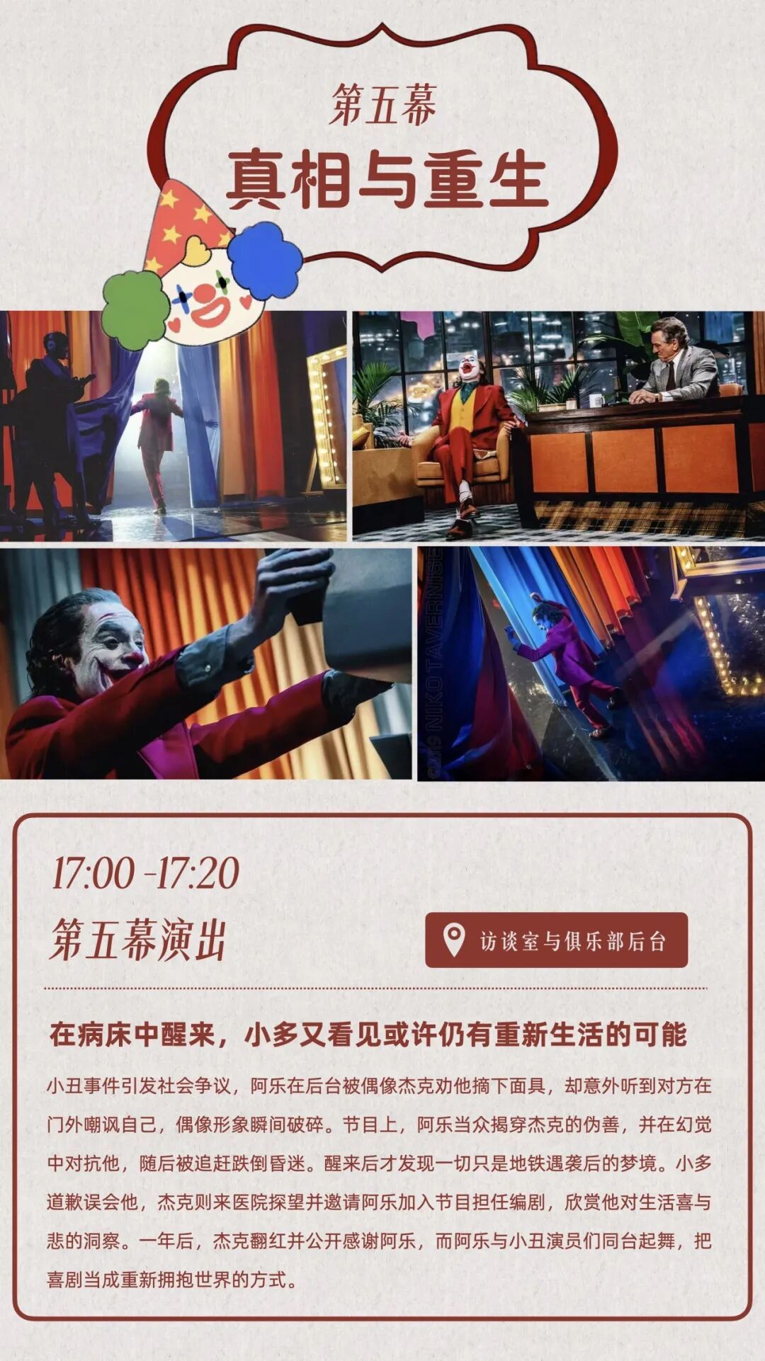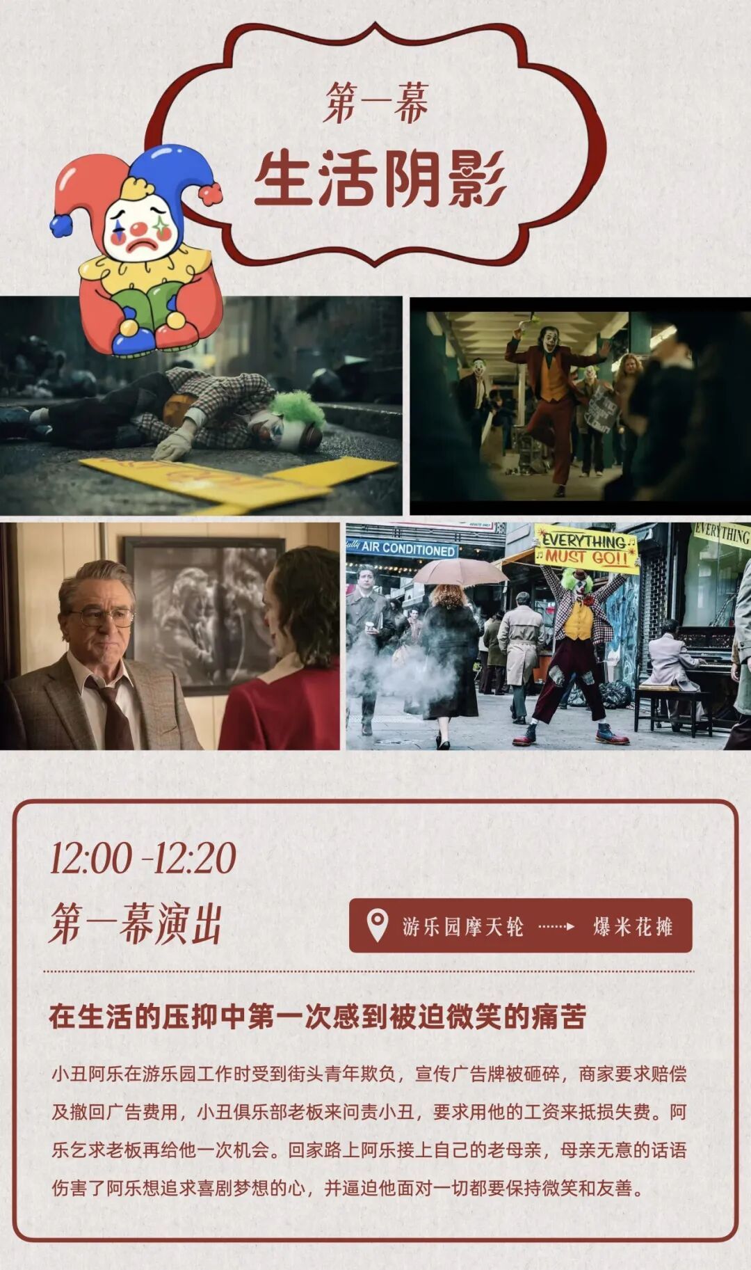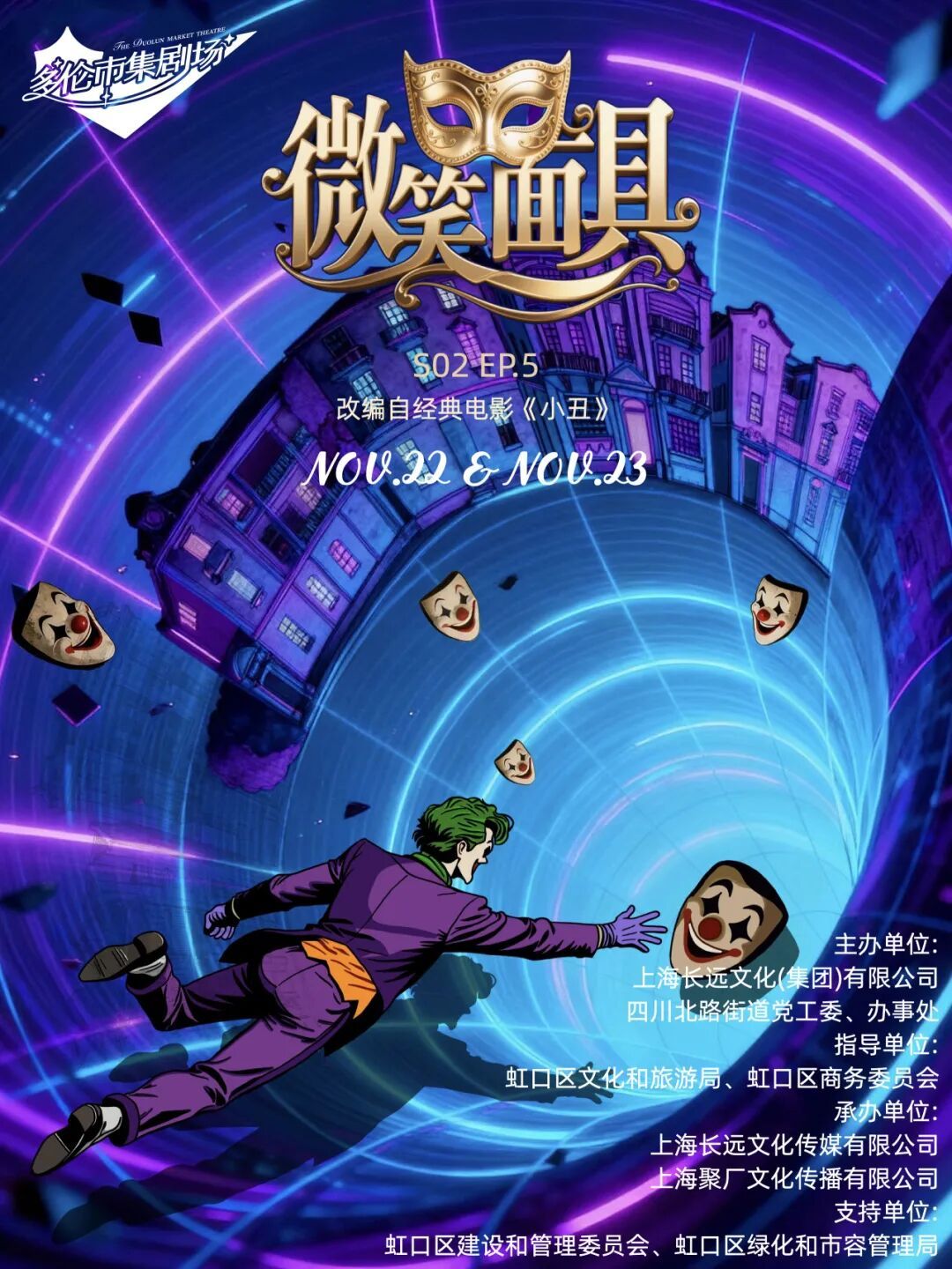 多伦市集剧场第二季第五集将上演《微笑面具》,改编自经典电影《小丑》,以“微笑面具”为意象,探讨现代人面具下的孤独与渴望,在真实与虚幻间展开一场关于自我的探索之旅。