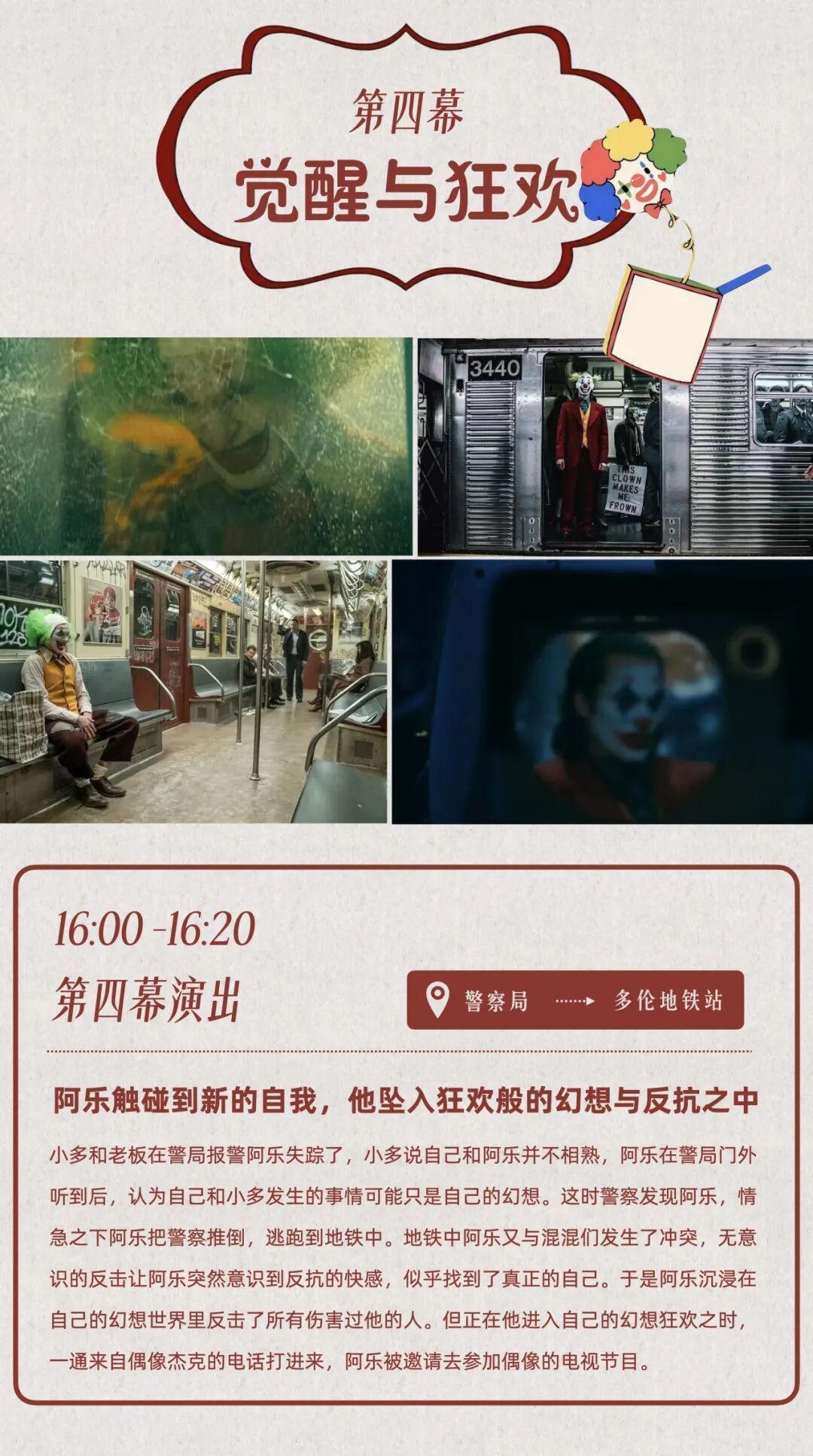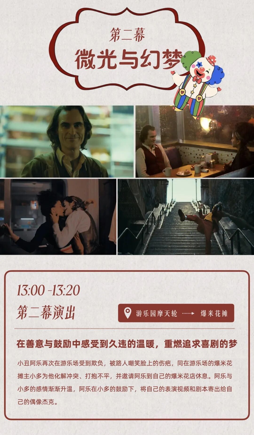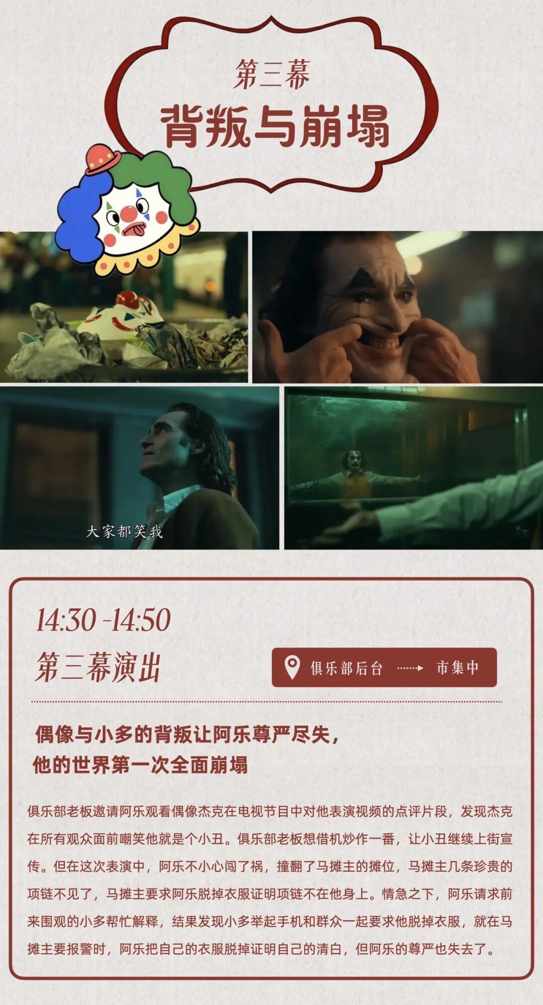 多伦市集剧场第二季第五集将上演《微笑面具》,改编自经典电影《小丑》,以“微笑面具”为意象,探讨现代人面具下的孤独与渴望,在真实与虚幻间展开一场关于自我的探索之旅。