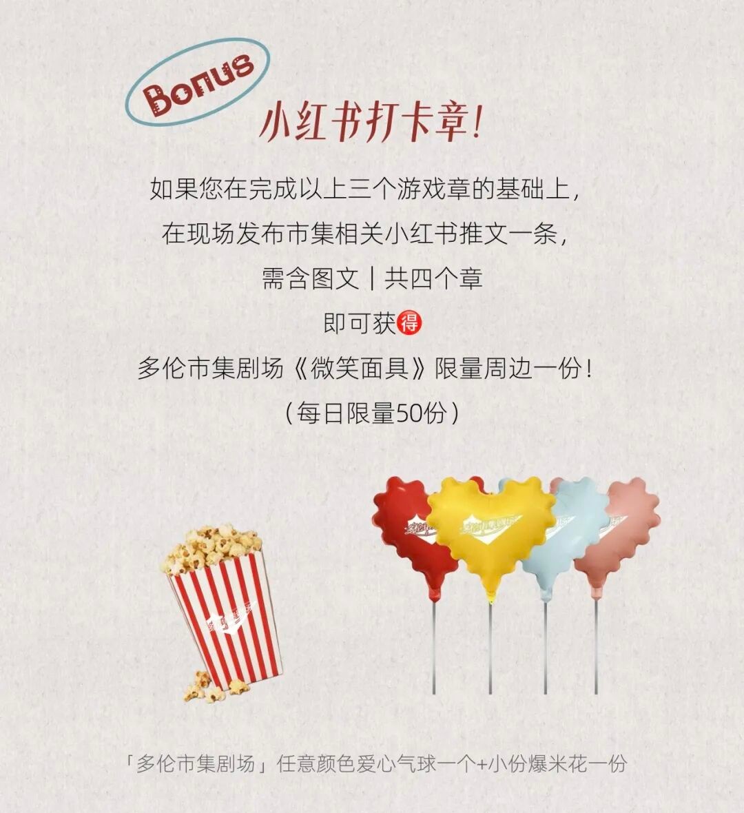 完成了以上3个游戏后,还可参与社交媒体打卡,收获多伦市集剧场《微笑面具》限量周边一份。(每日限量50份)