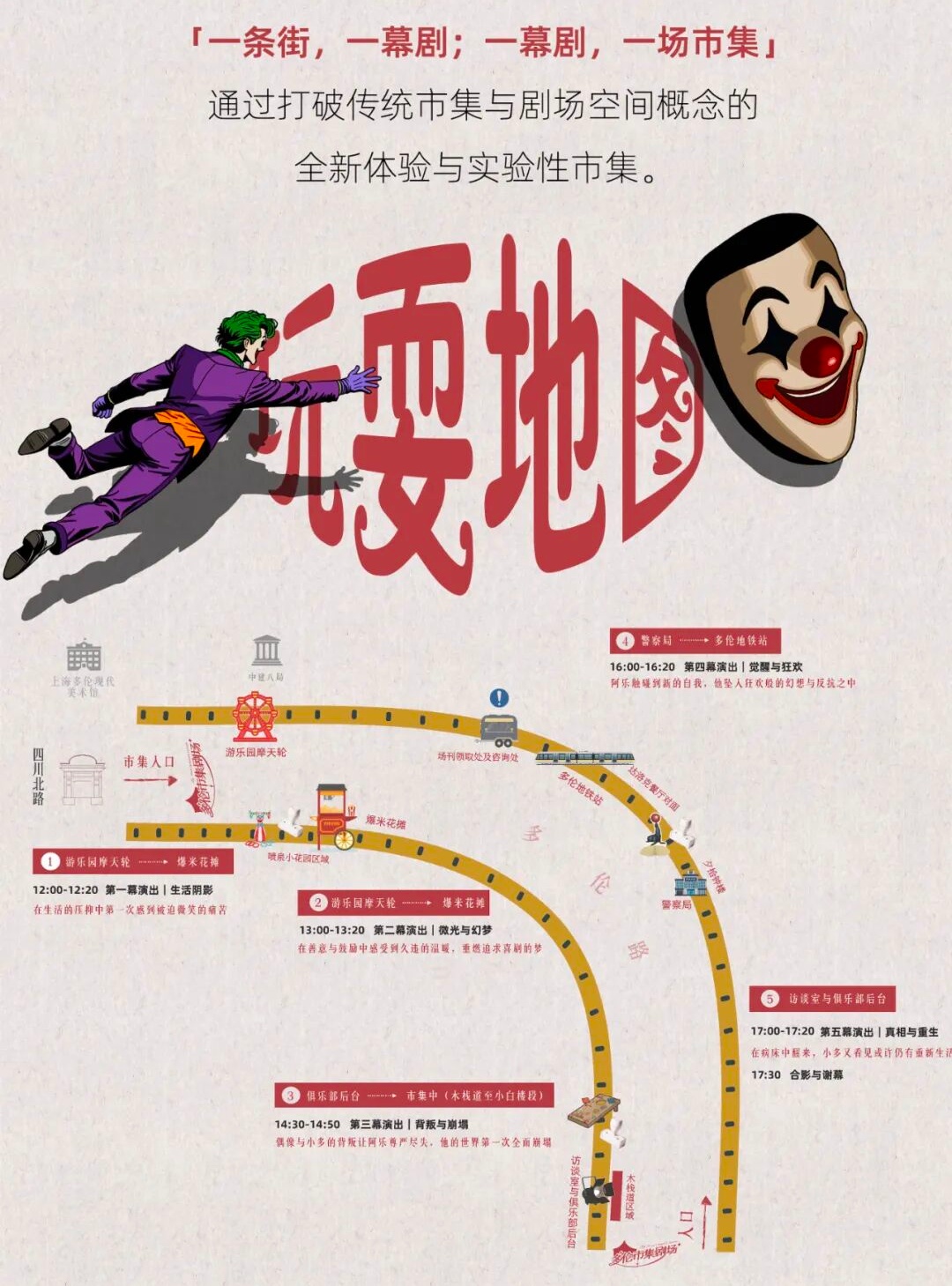 整场演出以行走式沉浸体验呈现,观众跟随“小丑”的叙事线索,穿越五大主题场景↓↓↓