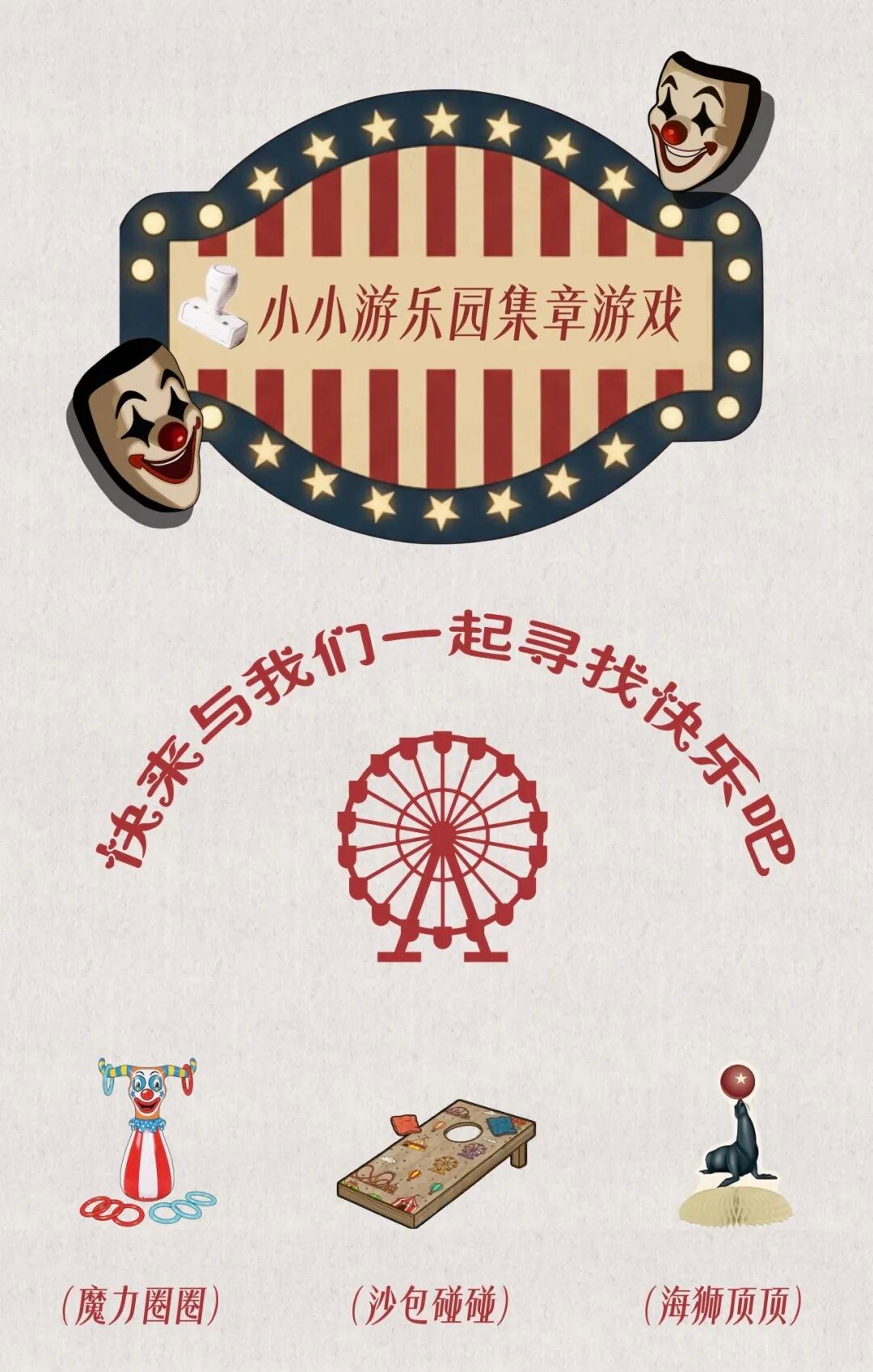 《微笑面具》的故事之外,还藏着一片小小游乐场。魔力圈圈、沙包碰碰、海狮顶顶,轻松的游戏、明亮的色彩和挥洒快乐的空间,让每个人都能像孩子般玩起来。