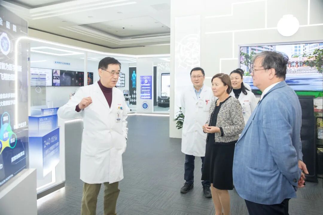 叶玉如校长一行在中国工程院院士、瑞金医院院长宁光、书记胡伟国的共同陪同下参观“人体数字代谢舱”集群、智慧医疗展区、瑞金医院运管指挥中心,了解瑞金医院智慧化、数字化建设及内分泌代谢病学科发展、全生命周期健康管理数字平台、医学数字人模型等研发情况。