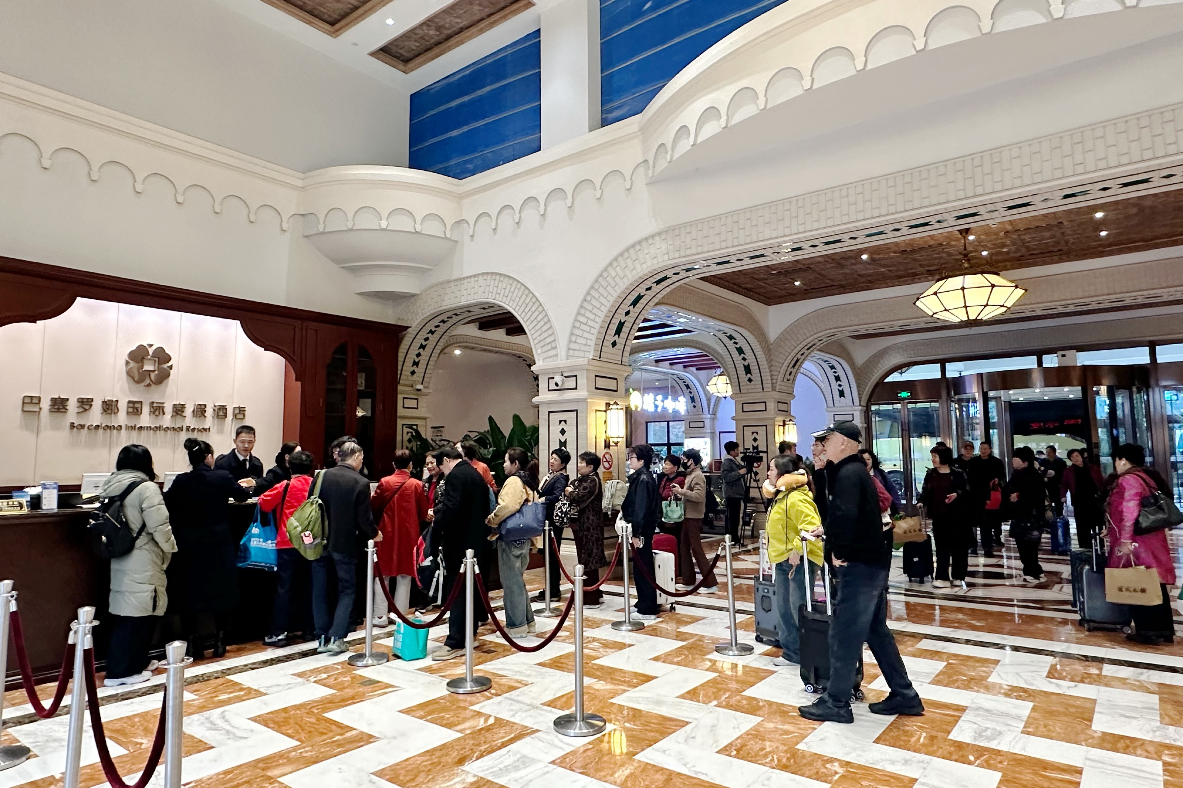 “这些银发族客人多数是组团而来,少则三五人,多则上百人。他们喜欢互相串门,白天房间开着门是常态。”酒店销售部总监陈婷向记者介绍。正说话间,一辆旅游大巴缓缓停靠在酒店门口,三十多名银发游客拖着行李箱,有说有笑地走进大堂办理入住手续,即将开启他们的“微度假”之旅。