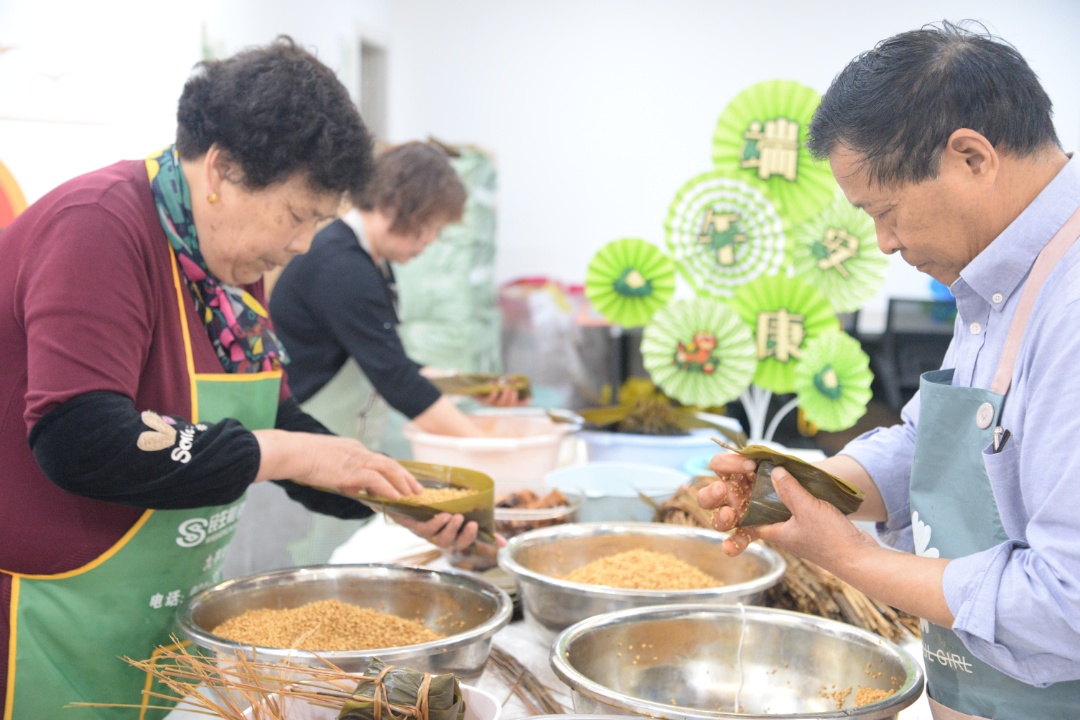 居民在九亭家园第二社区家门口养老服务站里包粽子