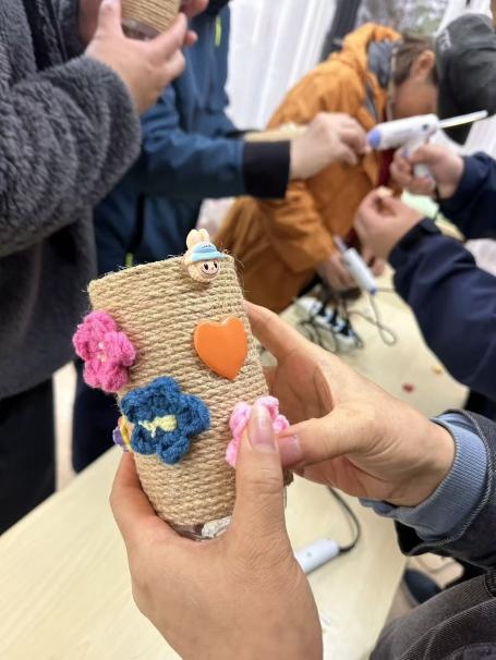 “我这个瓶子本来都要扔了,现在变成这么漂亮的花瓶,我要拿回家种绿萝!”她举起完成的花瓶,对着光端详,眼里满是成就感。