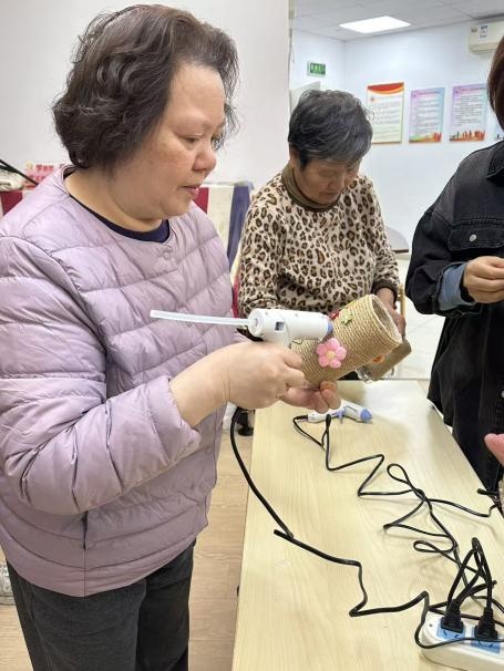“您试试这样,每绕三圈就在背面点一点胶水固定。”志愿者耐心地演示着。