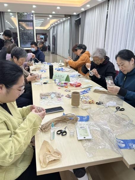 一旁的张阿姨正专注地装饰着自己的作品。她小心地将“爱心”和“Labubu”贴在缠好麻绳的瓶身上,又点缀了几颗小珍珠。