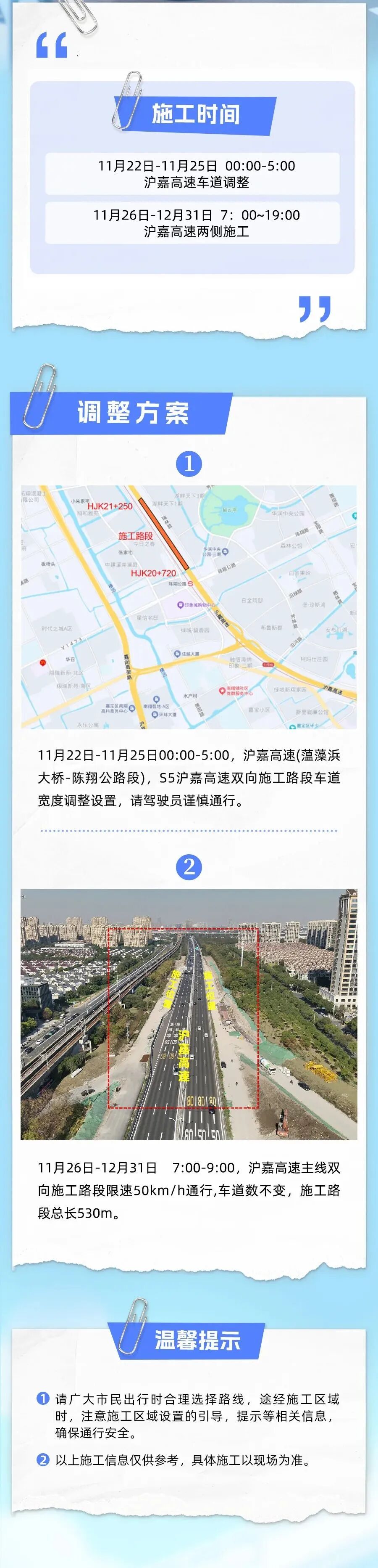 据市交通委指挥中心介绍,根据S5沪嘉高速—嘉闵高架联络线新建工程施工2标进度安排,11月22日—11月25日将进行沪嘉高速(蕰藻浜桥—陈翔公路段)两侧车道临时调整,并将在11月26日—12月31日,启动路段两侧高架引桥拼宽施工,此次施工为S5沪嘉高速陈翔公路立交段工程的一部分。道路施工过程中,S5沪嘉高速主线双向车道将有所收窄。现将具体交通组织情况通告如下↓