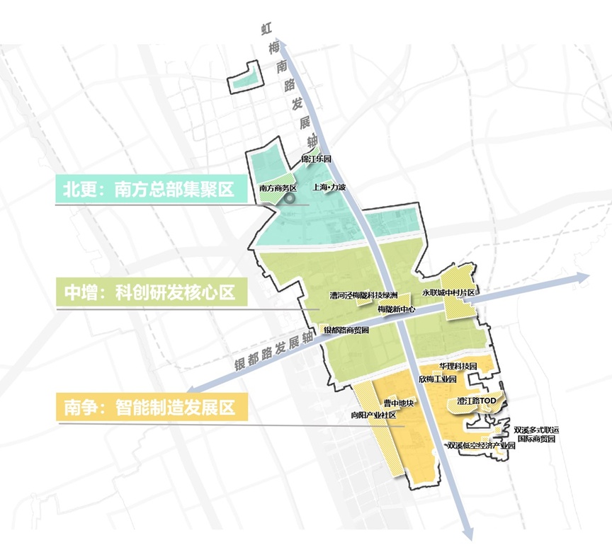 “十四五”期间,梅陇镇优化发展空间布局,提出了“三区两轴”空间新格局,推动产业格局重塑升级——“北更”区域打造南方总部经济集聚区,“中增”区域建设科创研发核心区,“南争”区域布局智能制造发展区。依托虹梅南路、银都路两大主轴,构建“南北聚产、东西汇商”发展动脉。通过三区协同、双轴聚力,构筑功能复合、产城融合、协同高效的高质量发展新格局。