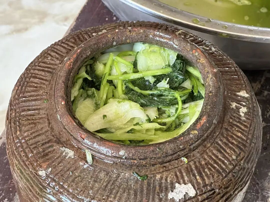 “腌菜的时候,盐要控制好,像这样一大盆菜的话,大概需要两把盐。”最后,朱阿姨将揉好的雪菜一层层码入缸中,每铺一层都用力压实,最后把菜缸安置在阴凉避光处,静待时间的催化。“再过一两个月菜就变黄了,就可以吃了。”